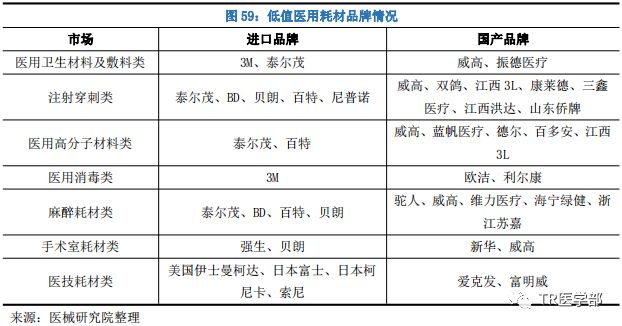 医用耗材 医用耗材,是指在为病人治疗过程中使用的医用材料。根据具体用途,医用耗材可分为血管介入类、骨科类耗材、神经外科耗材、非血管介入耗材、口腔科耗材、血液净化耗材、眼科耗材、电生理耗材、医用卫生材料、注射穿刺类耗材、医用消毒类耗材、麻醉类耗材、手术室耗材、医技耗材等;从价值角度讲,医用耗材又可分为高值医用耗材和低值医用耗材,其中低值医用耗材则是指临床多学科普遍应用的价值较低的一次性医用材料,如纱布、棉签、手套、注射器等。 低值医用耗材分类 根据具体用途不同,低值医用耗材可以分为医用卫生材料及敷料类、注射穿刺类、医用高分子材料类、医用消毒类、麻醉耗材类、手术室耗材类、医技耗材类等。 低值医用耗材市场情况 随着医疗卫生事业的发展,医用耗材在医疗服务中的重要程度也逐步提高,作为临床多学科普遍应用的医用耗材,低值医用耗材有助于提高检查治疗安全性,防止医患以及患者间因共用医疗器械导至疾病的传播,近年来发展迅速。 据国际评级机构惠誉(Fitch)qixia研究机构 BMI Research 在《Global Medical DevicesReport Q2 2017》报告中分析,2016 年全球低值医用耗材市场规模约为 528.07 亿美元,预计 2017 年和 2018 年市场规模分别将达到 552.94 亿美元和 581.33 亿美元。 受益于我国生活水平的提高,医疗需求的增长,低值医用耗材市场继续保持高速增长,据医械研究院测算,2018 年我国低值医用耗材市场规模约为 641 亿元,同比增长 19.81%。 低值医用耗材细分市场情况 据医械研究院整理测算,注射穿刺类在低值医用耗材市场占比最大,市场份额高达 30%,其次为医用卫生材料及敷料类,市场份额达 22%,市场份额排名前五的领域分别是注射穿刺类、医用卫生材料及敷料类、医用高分子材料类、医技耗材类、医用消毒类。 多年来,得益于改革开放的不断深入,凭借着低廉的劳动力成本和高速发展的技术水平,我国低值耗材产业发展迅速,涌现出一大批优秀的知名品牌,如威高、双鸽、康莱德、蓝帆医疗、三鑫医疗、江西洪达等。国产产品不仅占据了国内市场大多数份额,在国际市场也占据举足轻重的地位。虽然国产产品发展态势喜人,但受限于材料技术和工艺水平限制,在高端低值医用耗材市场暂时还是以进口产品为主。 低值医用耗材市场发展趋势 ▍国内市场重视程度不断提高 多年以来,得益于全球医疗卫生需求的不断增长,凭借着低廉的劳动力成本和高速发 ▍行业集中度加快 低值医用耗材,往往是临床多学科普遍应用的价值较低的一次性医用材料,相较于医疗器械其他领域,技术含量和行业门槛较低,因此多年以来参与企业众多,竞争激烈。但大多数中小企业缺乏技术创新和研发能力,单纯依靠仿制和外购器械零件组装来运营,只有极少数大中型企业具有完整产业链生产研发能力。随着技术的发展、医疗需求的提高以及市场竞争的加剧,低值医用耗材市场必将面临优胜劣汰的过程,市场将逐渐集中在具有核心竞争力的企业手中。 ▍多元化发展成主流 低值医用耗材行业门槛较低,市场竞争激烈,要想在众多企业中脱颖而出,行业大佬们的思路如出一辙,除了加强新材料、产品和生产工艺的创新研究以外,还加强了产业链布局,越来越多的企业选择多元化经营方式,在激烈的行业竞争和变革中做大做强,抢占先机。其中比较具有代表性的企业有威高和蓝帆医疗,两者相同之处在于,他们都是主营低值医用耗材业务,在做大的同时纷纷将产业布局延伸到同属医用耗材领域的高值医用耗材市场,并且都选择了血管介入市场,威高股份收购了美国爱琅,蓝帆医疗收购了新加坡柏盛国际,而两者不同之处则在于,威高很早就涉足高值医用耗材市场,主营骨科、血透等业务,并取得了巨大的成就,其中骨科业务经过多年的发展在国产品牌居于龙头地位。 |