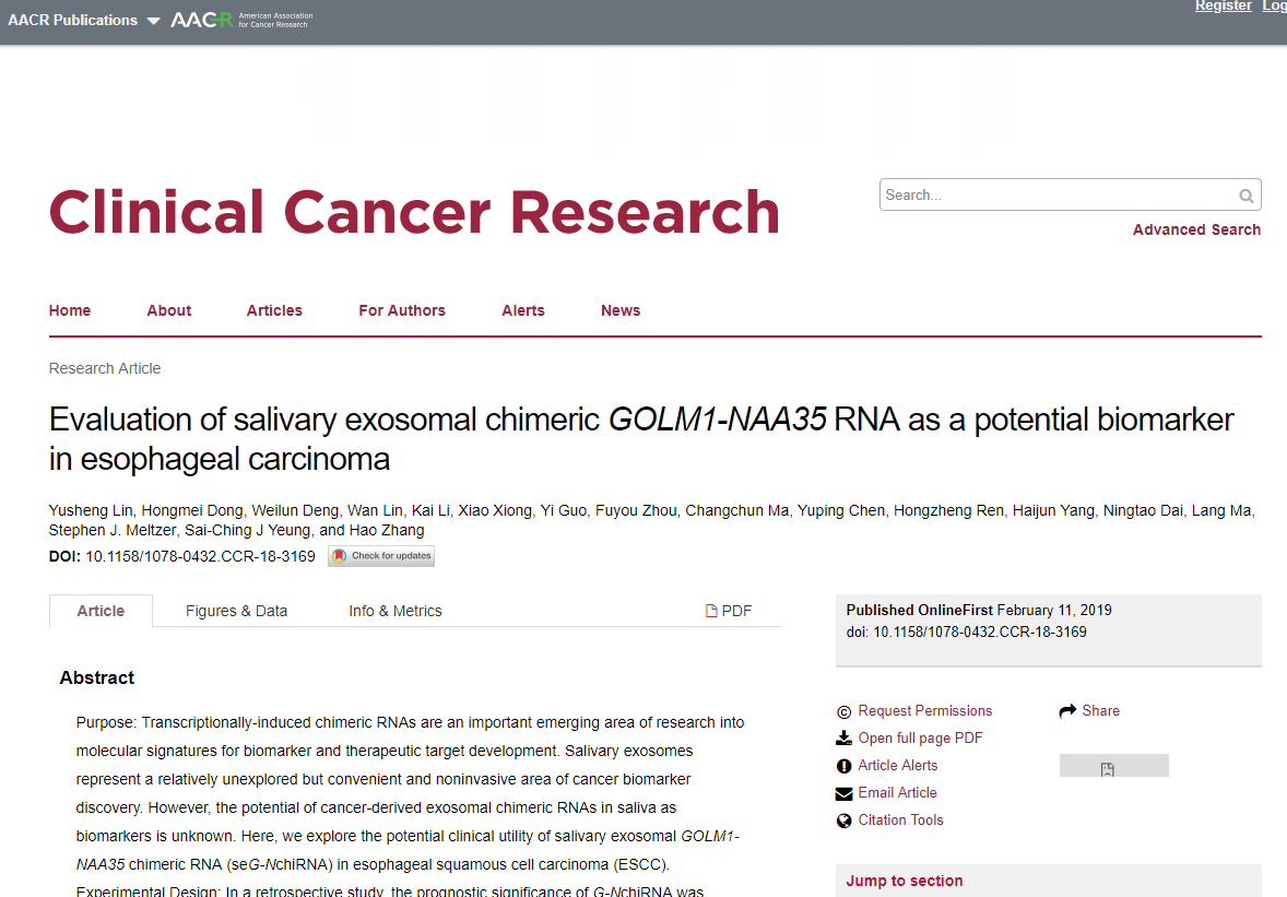 外泌体作为液态活检的三驾马车之一,特点和优势日益凸显,比如外泌体存在于各种细胞,外泌体检测不仅可用血液标本还可以用其它体液标本,外泌体不仅可以检测DNA,还可检测RNA和蛋白质等。外泌体液态活检在伴随诊断和肿瘤早诊早筛方面的应用前景,越来越受到重视。 和传统的液体活检材料血液标本相比,唾液活检具有独特优势,比如取材更方便、完全无创、避免血源性感染等。唾液不仅含有与血液相同的蛋白质(比如酶、激素、抗体以及生长因子等),还包含RNA和DNA等遗传信息。越来越多的证据表明唾液不仅能检测解剖位置相近的头颈或口腔疾病,还可应用于检查全身系统性疾病,包括肺癌、肝癌、乳腺癌、胰腺癌等其他部位的肿瘤,说明唾液活检具有不受肿瘤空间位置的限制的应用前景。但是目前应用唾液开展外泌体液态活检还鲜有报道。 食管癌是我国高发的恶性肿瘤。食管癌早期症状不明显,病人就诊时多为中晚期,治疗效果不佳、病人预后差、死亡率居高不下。目前缺乏指导精准治疗,预测疾病预后,和筛查早诊的肿瘤标志物。相比乳腺癌、肺癌等肿瘤,食管癌等我国高发恶性肿瘤的外泌体液态活检研究还较少。 近日美国癌症学会(AACR)官方刊物Clinical Cancer Research发表了暨南大学张灏教授课题组的最新研究进展。外泌体包含各种RNA,如目前研究较多的miRNA。课题组另辟蹊径聚焦肿瘤特异性的嵌合RNA(chmericRNA)。课题组在前期发现了转录过程中异常剪切产生的嵌合RNA命名为GOLM1-NAA35,GOLM1-NAA35定位于高尔基体,其产物可以分泌到细胞外。临床样本分析发现这种融合RNA和食管癌病人预后相关,可作为潜在的食管鳞癌预后的标志物。细胞实验中发现GOLM1-NAA35在外泌体中富集,在动物模型中发现唾液和血液外泌体中的GOLM1-NAA35水平均和肿瘤组织中的GOLM1-NAA35水平相关密切,动态检测小鼠唾液标本中的外泌体嵌合RNA水平可反映肿瘤生长的情况。 在后续的临床样本研究中,课题组通过多中心前瞻性食管癌病人临床队列研究(训练组n = 220;验证组n = 102),发现唾液外泌体嵌合RNA不仅可区分肿瘤病人和健康人,还可进一步用于区分早期的肿瘤病人。在监测治疗反应方面,手术切除肿瘤后食管癌病人的唾液外泌体嵌合RNA水平显着降低。放化疗是食管癌病人目前的主要治疗方案。在监测放化疗病人疗效方面,唾液外泌体嵌合RNA与目前临床应用的影像学相比能够更早的发现病人复发。通过计算唾液外泌体融合RNA水平的变化可预测化放疗后患者的PFS。鉴于唾液标本取材的方便无创,以及外泌体嵌合RNA的肿瘤特征性,这种液态活检方法,可用于动态评估治疗反应和检测复发,并可用于肿瘤早诊和早筛。 研究团队还包括汕头大学肿瘤医院、安阳市肿瘤医院、美国安德森癌症中心和约翰霍普金斯大学医学院等。 相关论文信息: http://clincancerres.aacrjournals.org/content/early/2019/02/09/1078-0432.CCR-18-3169 Evaluation of salivary exosomal chimeric GOLM1-NAA35RNA as a potential biomarker in esophageal carcinoma. Lin Y, Dong H, Deng W, Lin W, Li K, Xiong X, Guo Y, Zhou F, Ma C, Chen Y, Ren H, Yang H, Dai N, Ma L, Meltzer SJ, Yeung SJ, Zhang H. Clin Cancer Res. 2019, PMID:30745298 DOI: 10.1158/1078-0432.CCR-18-3169 |