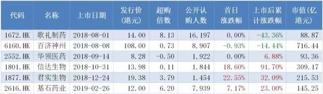 3月8日晚间,首家拟在科创板上市的医药公司诞生:复旦张江宣布拟在科创板上市,发行不超过1.2亿股的A股,募资6.5亿元。 科创板对标的是纳斯达克。而据统计,在纳斯达克上市的企业中,生物医药类公司数量占比27%,位于全行业第一,过往10年的生物技术指数明显跑赢纳斯达克指数。创新医药产业已经是当今毋庸置疑最炙手可热的领域之一。 打破A股IPO必须盈利的法则,允许未盈利企业上市是科创板一大重要特色。也正是这一条,将科创板与港股未盈利上市相提并论的讨论声不绝于耳。我们不妨先看看港交所的表现。 港股上市未盈利生物企业都过得怎么样? 截止目前,内地有6家未盈利生物药企先后赴港上市,分别是:歌礼制药、百济神州、华领医药、信达生物、君实生物、基石药业。 对于新创公司,上市无疑意味着公司里程碑式的成功,然而,由于未盈利,资本对这类公司并未表现出多热的热情,整体偏向于冷淡,有些甚至出现认购不足的情况。 港交所未盈利生物科技企业汇总 资料来源:wind,截至2019.3.5 从3月5日的数据来看,这6家企业的股票走势各不相同: