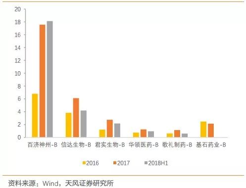 以上2家市值均为100亿以下,其余4家百济神州、信达生物、君实生物、基石药业则均超过了100亿。 从研发方向来看,这4家均专注肿瘤制药领域,且都手握最为火热的PD-1产品; 从在研管线来看,