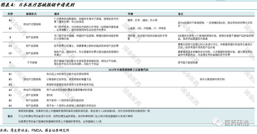 不同于药品单独就产品进行报销,日本自90年代初期开始在医疗器械领域采取功能分类报销制度,器械报销主要分为按产品报销和按服务报销两大类: 大约70%的器材并不单独就产品进行报销,产品报销即已经包含在所报销的医疗服务报酬点数中; 30%左右按照产品(SRMD,专门报销医疗器械,分为百余个大类和600余个小类,根据产品特性和性能参数再区分不同档次)进行报销。 同一个功能分类均采用同一个报销价格,例如在2008年前后,血管造影导丝存在约80个厂家,如果以每个厂家20个产品型号计算,大约有1600个相关型号,但报销价格均为3450日元(但有特别改良作用的器械可以在其对应的报销类别之上享受额外加成)。 日本医疗器械主要报销类型分为A/B/C/F四类,其中A类和B类主要针对相对成熟的医疗器械,而C/F类主要针对较新的医疗器械。A类器材按技术服务报销(包含在点数报销中),B类和C类则在技术收费之外,可以获得专门的产品报销。