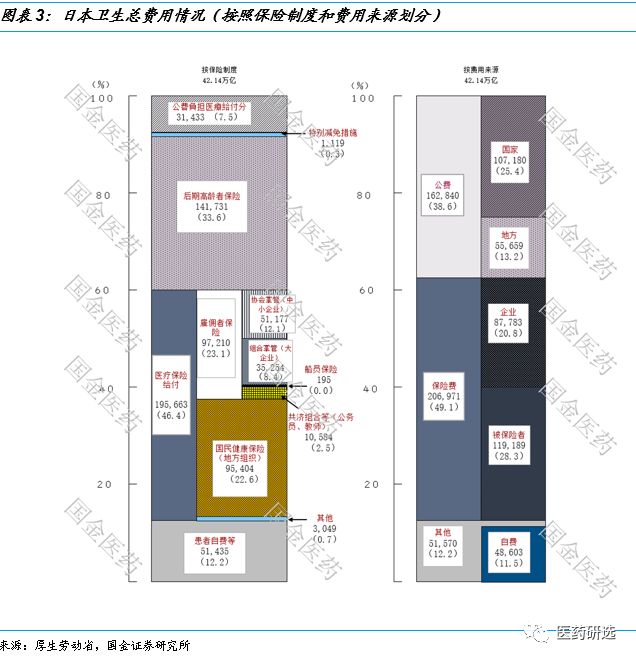 单一医保支付体系 日本实行全民医疗保险制,设有多种医疗保险,覆盖几乎全社会人群,个人只需支付个人负担部分(各类人员不同,一般为医疗费用的10%~30%),其余均由保险承担。 不同于美国更复杂的医保体系,日本的医保支付系统是统一的,医疗机构定期把医疗结算清单送交医疗保险部门,医疗保险部门委托第三方机构(医疗费用支付基金会和国民健康保险团体联合会)进行审查,核实医疗机构浪费的情况,再由医疗保险部门通知设在全国各地的医疗费用支付基金会和国民健康保险团体联合会办事机构向医院、诊疗所支付医疗费用。 中央政府按照不同诊疗项目的难易程度和综合成本,制订各诊疗项目及药品的“诊疗报酬点数表”进行积分计算,每点分值为10日元。日本诊疗报酬点数确定及调整的审批工作的具体事务由厚生劳动省的咨询机构—中央社会保险医疗协议会(Chuikyo)负责实施。政府每两年与医疗机构展开一次的磋商,确定治疗服务和药物的价格。