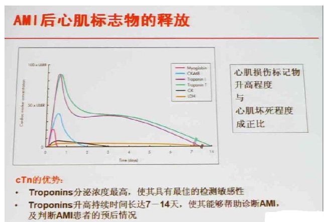 肌酸激酶(CK),肌酸激酶同工酶(CK-MB),肌红蛋白(Mb/Myo),心肌肌钙蛋白(cTn)等。这些标志物在正常情况下存在于心肌细胞中,心肌梗死发生后释放入血,若在血中发现这些物质水平升高则表明有心肌损伤存在。心肌肌钙蛋白(cTn)是目前临床敏感性和特异性最好的心肌损伤标志物,已成为心肌组织损伤(如心肌梗死)最重要的诊断依据。相对cTn而言,CK、CK-MB和Mb等对心脏疾病诊断的特异性稍差一些。