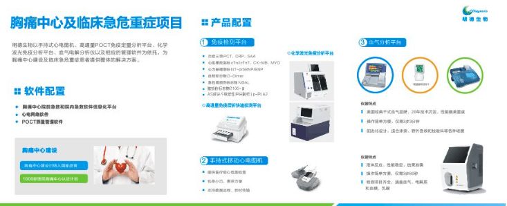 武汉明德生物科技股份有限公司成立于2008年。公司于2018年7月10日在深交所挂牌上市,募集资金3.4亿元,股票代码002932。2018年度明德生物取得了不错的业绩,实现营业收入1.77亿元,同比增长7.31%;实现营业利润6917.04万元,同比下降8.58%。其心血管系列POCT试剂盒产品涵盖了大部分标志物检测:BNP,Myo,CK-MB,cTnI,D-Dimer以及S100-β蛋白,心脏型脂肪酸结合蛋白(H-FABP)等。除了研发相关试剂盒产品外,明德生物还推出了移动心电图机和心电信息管理系统,响应和落实国家卫计委关于胸痛中心建设的要求和标准,打造胸痛中心整体建设解决方案,帮助医疗机构缩短区域内急性胸痛患者的救治时间,提高急性心梗患者的救治率。