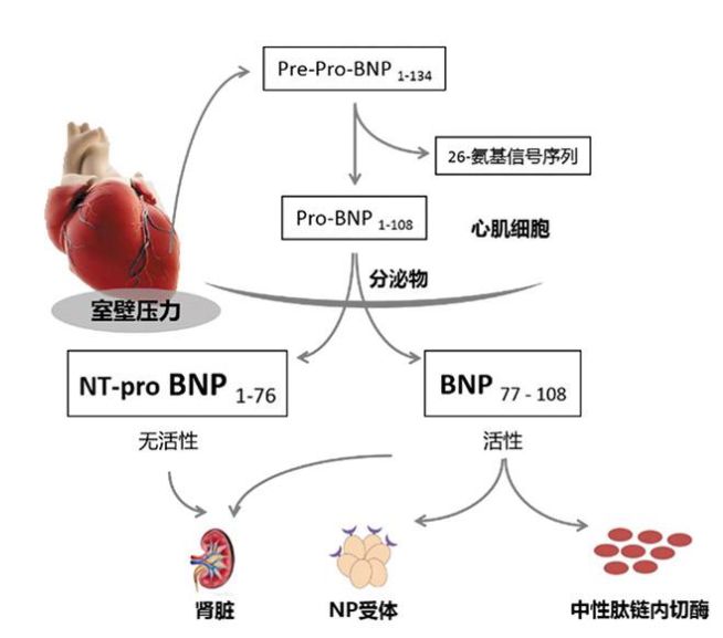 A型利钠肽 (A-type natriuretie peptide,ANP)和B型利钠肽(B-type natriuretie peptide,BNP) 分别由心房和心室分泌,是目前重要的了解心脏功能的标志物。BNP具有重要的病理生理学意义,它可以促进排钠、排尿,具较强的舒张血管作用,可对抗肾素-血管紧张素-醛固酮系统(RAAS)的缩血管作用。可溶性生长刺激表达基因2蛋白(sST2)作为一种能同时反映炎症、纤维化及心肌牵张力的新型生物标志物,可对心衰患者进行危险分层、预后评估及个体化治疗。