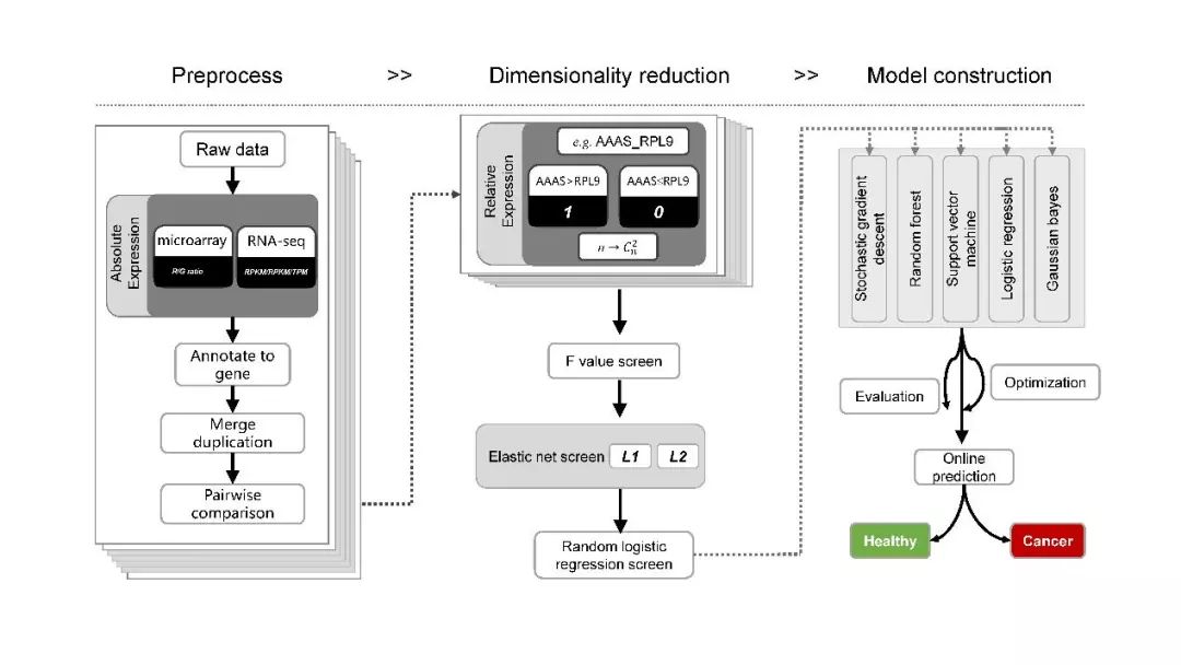 2019年3月20日,中国科学院北京基因组研究所方向东研究组等在Briefings in Bioinformatics发表题为Platform-independent approach for cancer detection from gene expression profiles of peripheral blood cells的研究论文,通过正常女性和乳腺癌病人外周血全细胞转录组比较,发现特定基因间的相对表达量大小可以区分正常人和乳腺癌病人,并发现相应基因在预测乳腺癌病人预后中的作用。这是首次通过大规模人群的外周血转录组数据来区分正常人和乳腺癌患者,相关算法模型已获批国家发明专利。 肿瘤是系统性疾病,在肿瘤发生发展过程中,除病灶位置外,外周血中多种细胞的表达量也发生变化,这使得我们有机会通过外周血在分子层次实现对肿瘤的追踪。研究人员整合公共数据库中上千例正常和乳腺癌个体外周血转录组数据,通过创新性的秩归一化方式屏蔽不同转录组检测平台、不同批次之间的噪音,并通过人工智能方法实现高维数据特征筛选和模型构建。在模型验证过程中,研究人员发现模型具有良好的泛化能力,在RNA-seq、不同芯片平台以及不同人种之间都取得了很好的预测效果。 该研究揭示了外周血转录组在肿瘤早筛中的作用。过往研究发现血小板转录组在预测肿瘤中的作用,但限于标准化方法不统一、数据集小等原因,取得的模型很难扩展到独立的数据集中,血小板转录组也受到除肿瘤之外其他因素的影响。该研究一方面整合外周血全细胞转录组,最大程度地降低了单一细胞类型受特定环境影响所导至的非特异性变化,另一方面基于秩序的标准化方法使不同来源的数据可以统一比较,大幅提升了可整合的数据量和肿瘤分类效果。 近年来乳腺癌发病低龄化趋势明显,为提高乳腺癌早期发现率并延长生存时间,外周血循环肿瘤细胞相关检测是研究热点,以循环肿瘤细胞(CTC) 为研究对象的一系列研究, 不仅能够对肿瘤患者的病情发展进行实时、动态监测, 更是了解肿瘤细胞内部致病分子机制的窗口, 从而为精准预防、精准治疗提供可能。目前相关研究已与解放军总医院等多个医学研究中心展开进一步合作,并已入组超过2000例正常女性、不同时期乳腺癌患者和高危人群,希望通过进一步的前瞻性研究提高分类效果,实现乳腺癌的早期诊断,减轻家庭和社会负担。该研究得到了国家重点研发计划精准医学专项、863计划等基金资助。 数据标准化、特征筛选及模型构建 |