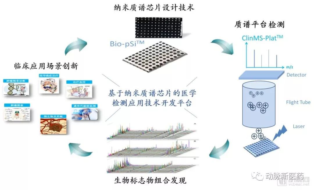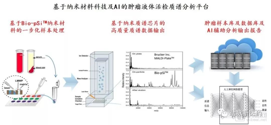 图:Bio-pSi质谱芯片 汇健科技的Bio-pSi纳米颗粒能从复杂的血清样本中富集低丰度的肽类物质,捕获到纳米孔道当中的多肽分子可以很容易地被浓缩富集,并且能够有效地防止肽段被血液中的蛋白酶降解。 随后,在MALDI-TOF-MS平台上使用公司独创的颗粒原位质谱检测(OPMD)技术可实现血清肽谱的快速分析。结合特征质谱峰及人工神经网络软件生成的预测模型,可实现肿瘤的诊断,复发转移监测及药物疗效评价。 将材料学技术与质谱技术结合正是汇健科技有别与传统质谱医学检测行业的核心差异化亮点。