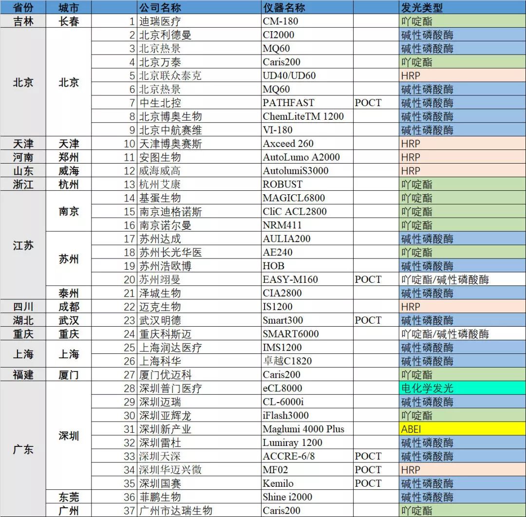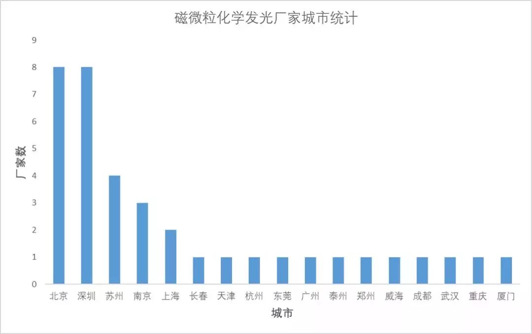 化学发光免疫分析结合了化学发光的高灵敏度和免疫分析的高特异性,在临床检验,药物分析,环境监测等领域得到了广泛应用。 化学发光免疫检测可以分为两种方法,一种是基于96孔板固相载体的非均相反应方法,另一种是以超顺磁性颗粒为固相载体的均相反应检测方法。基于磁性颗粒的化学发光技术是免疫诊断中最为先进的检测技术,也是目前化学发光免疫检测的主流。国际巨头无一例地都采用了磁微粒式化学发光免疫检测技术。 国内在此技术领域虽然起步较晚,但是随着技术的兴起,资本的流入,目前发展极为快速。本期我们聊一聊国内基于磁微粒化学发光厂家的城市分布特点。 本次一共统计了37家具有磁微粒化学发光免疫检测技术的厂家。 △生物医学知识局制图 磁微粒化学发光免疫检测作为高新技术,需要人才,技术,以及资本的支持,因此毫无意外的,国内厂家主要分布在中国经济最发达,高校分布最密集的地方。 1、北京-天津 2、以南京-苏州-上海为中心的长江三角洲 3、以广州-深圳为中心的珠江三角洲 4、其余厂家也都坐落在省会城市,或者是最为发达的城市内 △生物医学知识局制图 统计当中,北京,深圳各拥有8家,居各大城市之首,苏州4家,南京3家,上海2家,其余城市各只有一家。作为极具创新,需要人才,资本,资源的国内新兴行业,磁微粒化学发光免疫检测的厂家分布也从一定程度上反应了城市发展创新指数。 根据一份2016年的中国城市和产业创新力报告,排名前六的分别是北京,深圳,上海,苏州,杭州,南京。 △生物医学知识局制图 另外从统计表中看,碱性磷酸酶,吖啶酯已经成为了主流,分别有17家和10家厂家采用这两种发光方式,另外苏州翊曼和重庆科斯迈的仪器能够适配两种发光方式。由于罗氏电化学发光专利过期不久,因此采用电化学发光的目前只有深圳普门。采用何种发光方式并没有明显的区域性,碱性磷酸酶采用的厂家最多,从南到北都有分布,吖啶酯稍微集中在长江流域,但是北京区域,深圳区域也有厂家采用。 虽然国内磁微粒化学发光免疫检测起步较晚,尚未有厂家能够对4大家构成直接威胁,但是经过10多年的发展,已经取得了一定的技术突破。以郑州安图,四川迈克,深圳迈瑞为代表的企业依然不断加大在这方面的投入。 笔者相信,未来5年,10年,国产磁微粒化学发光,以及其他先进检测技术,一定能够取得一席之地,并能够走向国际。 |