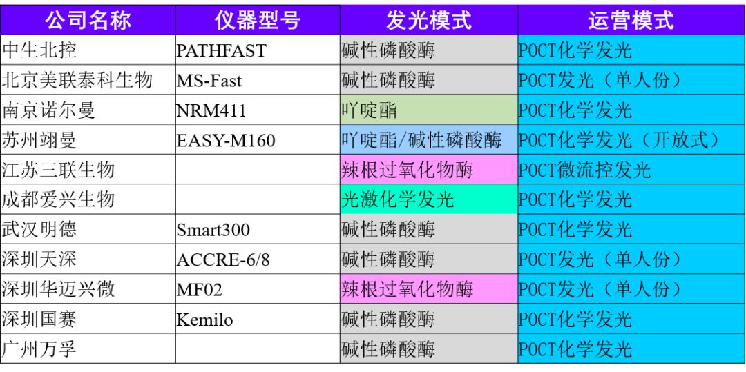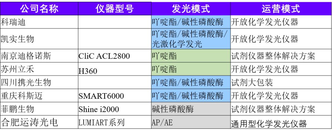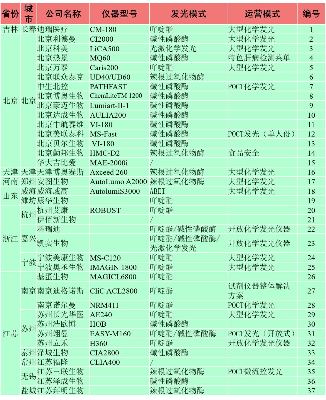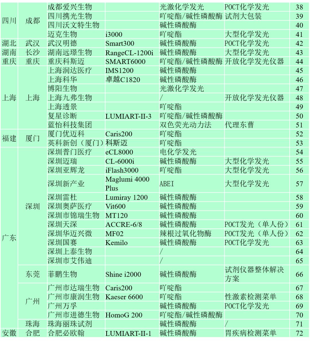 我们之前的文章对国内的磁微粒式全自动化学发光厂家(点击可直接跳转文章)做了较为详细的分布统计,本期我们对统计过的厂家做更进一步的信息拆解。 化学发光免疫分析结合了化学发光的高灵敏度和免疫分析的高特异性,是免疫诊断领域中最新的技术。全自动化学发光免疫分析具有极高的安全性、智能性、准确性以及可靠性,是现阶段医院检验科的主打仪器,其检测的标志物涵盖了肿瘤、心肌、传染病、骨代谢、甲状腺功能、性激素等,几乎所有疾病领域。目前国内化学发光市场主要由我们常说的四大家垄断,即雅培、罗氏、贝克曼、西门子等。近10年来,以新产业为首,国内涌现出一大批化学发光厂家,向进口厂家发起了冲击。中国市场估计有接近一百家化学发光厂家,并且依然不断有新的玩家进入该市场。本期我们就对上一期全国化学发光厂家统计表做出更新,并且更新了厂家的全国分布图。并且对化学发光厂家的运营模式进行了分类讨论。 化学发光厂家的地域分布 本次我们一共统计了73家全自动化学发光厂家。主要是磁微粒式化学发光厂家,也有一小部分光激化学发光厂家。从区域上看,化学发光厂家依然主要集中在北京-天津,以上海为中心的长江三角洲,广州-深圳区域,三个区域,成三足鼎立之势。如果按照城市算,北京、深圳独一档,分别有14、12家全自动化学发光厂家,是体外诊断厂家分布最为集中的两极。 △化学发光厂家城市数量分布 △化学发光厂家城市热点图 我们也对各个厂家的发光模式做了一定统计,传统的碱性磷酸酶辉光型、吖啶酯闪光型占据了一半以上的厂家数量。其中采用碱性磷酸酶作为标记的有27家,采用吖啶酯的有18家,开放式平台两者兼容的有8家。值得注意的是,成都爱兴,上海博阳,北京科美都开始采用光激化学发光形式。
