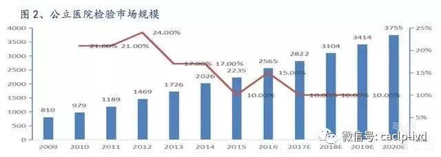 2016年全国公立医院检查收入2565亿元,同比增长15%,按每年10%的增速来推算,到2020年公立医院检查规模有望达到3755亿元。 全国33235家医疗检验检测机构中,企业制检验检测机构达21012家,占机构总量的63.22%。这标志着检验检测市场化机制正在形成。