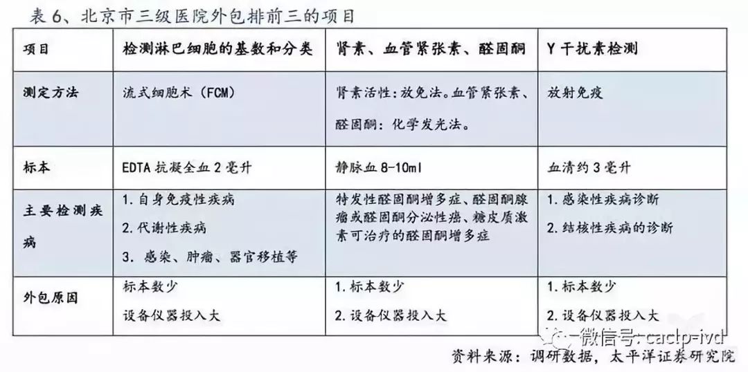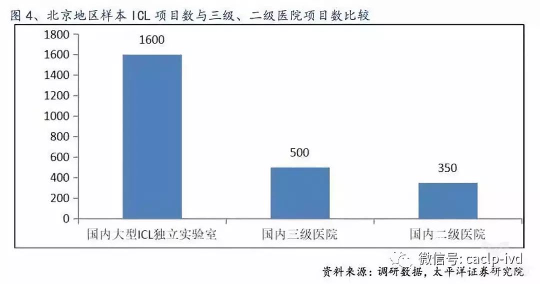 2、ICL实行采购一体化管理,市县乡各级检验中心的试剂和耗材进行统一采购和管理,降低成本,推动检验结果互认。 连锁ICL搭建的地区平台,能够带动市县乡医疗机构或医联体检验资源相互支持、相互调配,从而带动区域整体检验水平的提升,推进分级诊疗。 同时提升基层医疗机构检验诊断能力,提高地区检验服务水平,推动检验结果同质化以便互认。 由于ICL采购耗材数量大,有采购价格优惠的优势,并且ICL的设备使用率和试剂的使用率也比医院高。举个例子,北京地区规模较大的综合医院开展的检验项目数平均约500项,各医院开展检验项目90%以上是同质化的;ICL具有资源整合和集约发展的优势,可以有效降低成本、提升效率。 经调研得出以下结论:未来三级医院检验科将更加规范、成本更加透明,检验结果更加准确、及时、安全、可靠。标准化实验室将大行其道。 医院检验项目外送是医院发展必然之路,但要分区域、分医院层级在看待,ICL与医院的合作,更多是区域性的开展业务;二级以下医院外送项目扩增幅度更大。 北京地区医保等政策的约束尽管影响较大,调研的两家一级医院目前没有开展,但医院反馈的意向是强烈的,必将助推ICL对医院检验科项目外包。 暂时三级医院检验科项目外送不多,但特殊项目、基因检测等增量大的项目都会接受外包服务模式。 医院外包空间分析:渗透率提升是长期过程,10年5倍,20年10倍以上空间三级医院外包空间分析:受限较多,放开过程预计较缓慢 三级医院自身的检验业务应接不暇,且在降低药占比的趋势下,检验科收入占比逐年提升,理论上医院外包动力是不足的;但在实际调研中我们发现,部分三级医院的检验科主任和院长对检验科外包的意愿比预期要高——三级医院面对的病人疾 病复杂程度高、病理检验技术针对性强,大型连锁实验室的高技术平台能够很好地满足其需求。 例如,北京市三级医院外包较多的肾素、血管紧张素、醛固酮检测,就是由于标本数量少、仪器设备投入大,检测报告结果时间长等原因导至医院普遍放弃自行检验。 因此决定检验科外包与否的关键因素之一是第三方检验机构的项目范围、数量和技术平台能否达到三级医院的要求。 就企业本身而言,在保证检验结果准确的情况下,更多的降低医院成本、提升效率,是衡量独立实验室能否在三级医院推广开的重要因素。