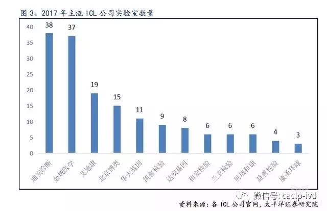 第三方独立实验室渗透率迅速提升 独立医学实验室(IndependentClinicalLaboratory,ICL)又称第三方医学实验室,是指在卫生行政部门的许可下,具有独立法人资格、独立于医院之外从事临床检验或病理诊断和服务并能独立承担责任的医疗机构。 它与医疗机构建立业务合作关系,集中收集并检测这些机构采集的标本,并将检验结果送回以应用于临床。 ICL的最大特点是资源共享,具有显著的规模效应。 2007年我国独立医学实验室只有37家,之后发展平缓,2015年在“社会办医”的政策推动下,实验室数量由年初的216家增加至356家(增幅65%),并在2018年9月达到1200余家。 2016年独立医学实验室市场规模约为105亿元,2017年达到144亿,yoy37.42%,过去8年CAGR41.57%。 计算渗透率,则要虑医院与ICL之间的分成,渗透率=ICL规模/(医院检验科规模*扣率),参照检验市场16年-17E的2565亿、2822亿规模,假设50%的扣率,则渗透率为10%。 不同地区、不同ICL企业、不同项目扣率差异大。