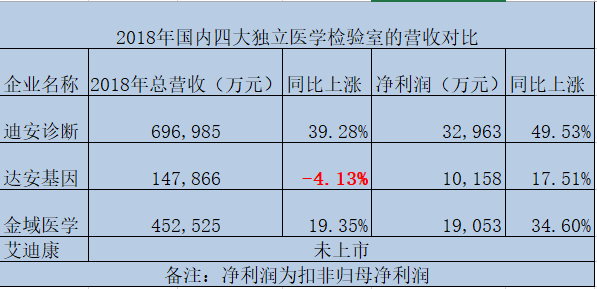 近日 ,国内第三方独立医学实验室艾迪康、金域医学、达安基因、迪安诊断四大巨头的年报相继公布!通过对比查看,2018全年迪安诊断以总营收696,985万元位列第一,金域医学以452,525万元总营收位居第二、达安基因营收出现负增长。 接下来,我们来详细了解一下这4家企业在2018全年中的经营模式、研发投入、销售规模等方面有何优势和差异? 目前,国内独立医学检验实验室市场是以金域医学、迪安诊断、艾迪康、达安基因四家龙头企业为主!这4家ICL实验室总数合计超过100家,份额占第三方检验市场的70%左右。 这也意味着,我国ICL市场是以这四大巨头为主导,也占据国内ICL的大半壁江山。 从上述数据来看,2018全年营收最高的是迪安诊断,其次是金域医学、达安基因(营收代表企业规模)。 净利润方面来看增长最快的也是迪安诊断,其次是金域医学、达安基因(净利润凸显企业活力)。 另外,艾迪康是医检四大巨头中唯一一家未上市的公司,公司详情信息并不对外公布。但是,通过查看相关信息可以了解到目前为止艾迪康估值为4.4亿美元,折合人民币约29.6亿元。 值得注意的是,达安基因在2018年中总营收同比去年来看,呈下降趋势。 迪安诊断 根据迪安诊断年报披露,2018全年营收696.985万元!全年的研发投入资金为16,948.26万元,占比26.15%!基于丰富的产品业务模式下来看该企业研发占比,这个26.15%的研发占比虽然很高,但这也是迪安诊断企业扩大发展所必须投入的。 另外,从细分领域来看,2018年全年中迪安诊断: 诊断产品的收入为447,069.80万元,同比增长49.22%。 诊断服务收入为229,958.67万元,同比增长22.38%。 健康体检收入为9,824.52万元,同比增长35.30%。 冷链物流收入为2,081.11万元,同比增长44.72%!。 司法鉴定收入为6,231.39万元,同比增长128.68%。 可以看出,迪安诊断在IVD领域布局非常丰富!2018全年中,迪安诊断的司法鉴定板块增长最快,到目前为止迪安有9家司法鉴定机构。 紧跟其后的是体外诊断产品销售和冷链服务的增长,该公司的共建客户数量有400多家!签约三甲医院10余家!随着配送供应的一体化服务迪安诊断产品的销售额再度被拔高。 另外,众所周知,迪安诊断还是罗氏诊断、德国QIAGEN、德国科宝等全球著名企业产品代理资质,这为迪安的全国诊断市场提供了巨大优势。 这几年,迪安诊断也在积极建设着质谱平台、基因测序平台等!目前,专业的质谱平台国内还属于空白领域。而基因测序平台国内也是以华大基因主导。 以此发现,迪安诊断非常敢于去尝试新型的领域,这其实也是上市公司应具有的开拓创新精神!但迪安诊断似乎将这一领域发挥到极致。 近期迪安诊断的大动作: ●迪安诊断牵手丹纳赫共设合资公司进入使用阶段。 ●迪安诊断联手9家浙江省大三甲医院共建区域检验中心。 ●迪安诊断与天士力集团在体外诊断领域达成战略合作。 金域医学 根据金域年报披露,2018全年营收452,525万元,同比增长19.35%!净利润全年收入19,053万元,同比增长34.60%。 科研投入2.91亿,占比6.34%。 从2018年金域医学检验室服务细分领域来看 医学诊断服务收入:423,529万元 销售诊断产品收入:8037.28万元 体检业务收入:7562.28万元 冷链物流服务:1754.02万元 其他收入:11,641.63万元 在2018年中,金域医学的服务范围和迪安诊断同样丰富!相比较来看,金域医学更加深耕于第三方监测技术的提升。 金域医学医学成立于2003年,检验业务包括质谱检验、基因组检验、病理检验、生化发光检验等!另外,金域医学也在积极拓展非医学类检测业务,例如食品检测等。 值得注意的是,虽然迪安诊断在营收和净利润方面增长最快,但金域医学在体外诊断领域也有着自己独角兽的一面。 在四大检验巨头中,金域医学在实验室数量、市场覆盖面、检测项目数量上均处于领头地位!另外,金域医学位于广州,形成了以珠三角为核心的优势区域覆盖!服务范围非常核心并且拓展能力非常便捷。 近期金域医学大动作 ●2019年1月4日,金域医学与美国癌症基因组学领域的领导者PGDx建立战略合作伙伴关系。 ●2018年8月7日,金域医学投资香港基因检测服务及体外诊断产品研发商DRA公司。 达安基因 根据文章开头的图表数据可以看出,4家医检巨头只有达安基因出现了负增长!具体负增长原因达安基因2018年报中并未披露。 达安基因细分领域营收情况 生物制品业:138,991.62万元 占营收比重94% 试剂类:66,239.37万元 占营收比重44.80% 其他耗材::2,632.84 占营收比重1.78% 达安基因于2004年8月在深交所挂牌上市,也是广东省高校校办产业中早期上市公司。达安基因是国内分子诊断试剂行业的龙头企业。 达安从1995年就开始布局分子诊断实验室,且在无创产前基因检测领域与医院(三甲为主)合作共建了100多家实验室。 在特检领域,达安基因布局多时。在4大独立诊断实验室(ICL)中,从规模和盈利能力看,达安基因暂时处于劣势,但依靠公司的分子诊断产品优势,达安基因有望实现弯道超车。 艾迪康 值得注意的是,艾迪康目前还未上市,所以公司并不对外披露年报。 艾迪康成立于2004年1月8日,在全国设立了20余家医学实验室。目前,艾迪康拥有临床、病理、生殖遗传、基因检测、临床试验5大中心实验室和研发中心,提供2000余项检测项目。 另外,艾迪康有自己的专门的试剂公司和研发中心,可依托qixia子公司艾康,供应极具优势的试剂给医院使用。不过在未来前景广