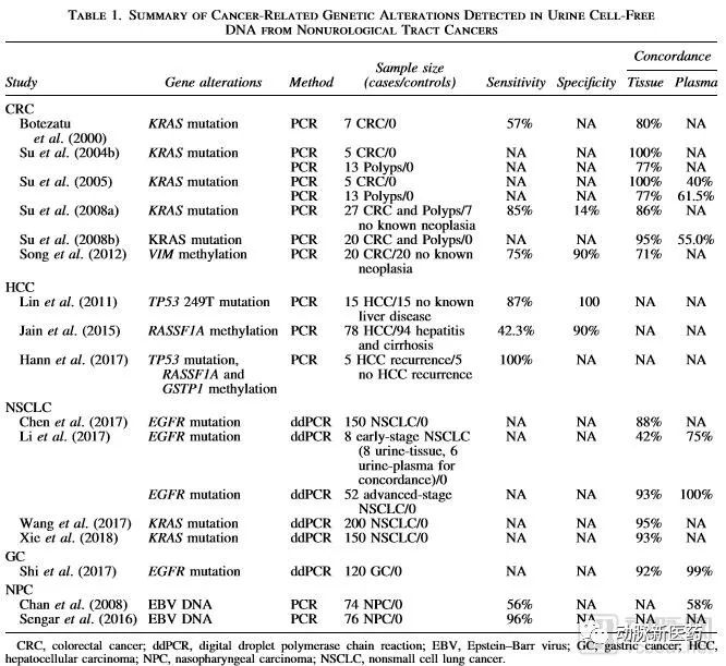 美国癌症学会把尿液液体活检作为膀胱癌筛查的首选方式列出,包括尿液分析,尿细胞学检测和尿液肿瘤标志物三种方式。在我国的《膀胱癌诊疗规范(2018年版)》中,也将尿液液体活检列为了膀胱癌的诊断方式之一。尿液液体活检通过对尿液进行细胞学检测或肿瘤标志物检测,来对受试者的患病情况进行分析和诊断。 但是目前的尿液肿瘤标志物由于特异性较低,还没在临床上广泛使用。我国的《诊疗规范》中仍把影像学检查列为膀胱癌的主要筛查方式。 图片来源:Surbhi Jain,Selena Y.Lin,et al.Urine-Based Liquid Biopsy for Nonurological Cancers.GENETIC TESTING AND MOLECULAR BIOMARKERS.23,4(2019). 2019年发表于《GENETIC TESTING AND MOLECULAR BIOMARKERS》上的一篇综述文章上,汇总了目前为止使用尿液液体活检检测非泌尿系统癌症的研究成果。 从表单中可以看到,自2000年至今已经有大量研究成果表明,使用PCR或ddPCR技术进行尿液液体活检,已经可以在尿液中检测到非泌尿系统癌症携带的基因突变。目前为止多数的研究成果都表现出较好的敏感性,并且检测结果与组织或基质的检测结果相比,一致性都在70%以上。 但是目前尿液液体活检的特异性还不够高,这可能会成为尿液液体活检未来发展中的瓶颈。