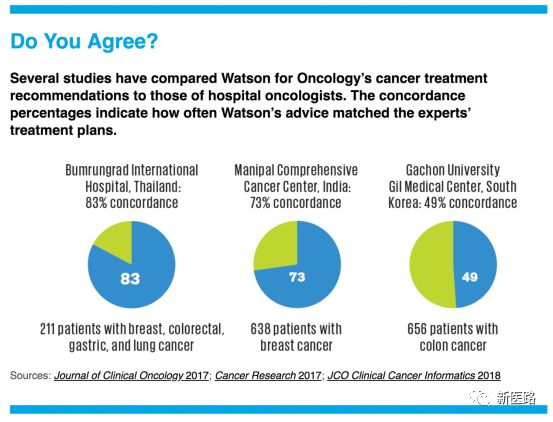 一些研究将Watson for Oncology 癌症治疗建议与医院肿瘤学家的建议进行了比较。下图为Watson 的建议与专家的治疗计划相匹配的百分比。