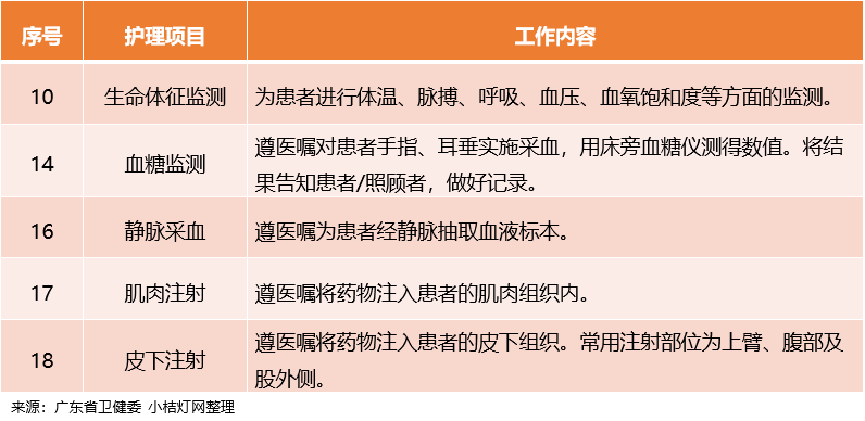 从各地公布的护理项目来看,其服务项目涉及的范围大致相同,生命体征监测、血糖检测、标本采集、皮下注射和肌肉注射等均在列。另外,江苏还明确了“负面清单”,禁止涉及含有精神药品、医疗毒性药品、放射性药品等特殊管理药品和有创操作技术项目等。