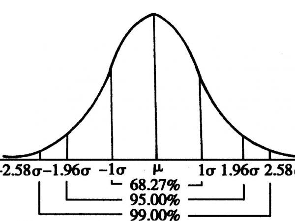 另外,正态曲线下的面积分布是有规律的,正态分布曲线与横轴之间的整个面积为1,那么我们可以μ(总体均数)为中心,以σ(总体标准差)为单位,在μ(总体均数)左右两侧分别截取不同倍数的σ(总体标准差),得到某一区间的面积占总面积的比例。用此估计变量值落在此区间内的概率。在区间μ±σ范围内的面积约为68.3%,在区间μ±1.96σ范围内的面积为95.0%,在区间μ±2.58σ范围内的面积约为99.0%。如下图所示。