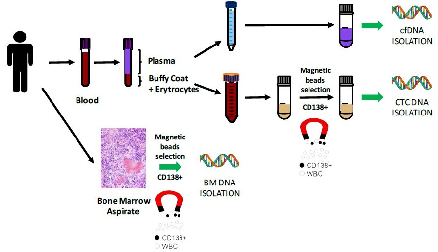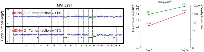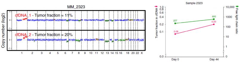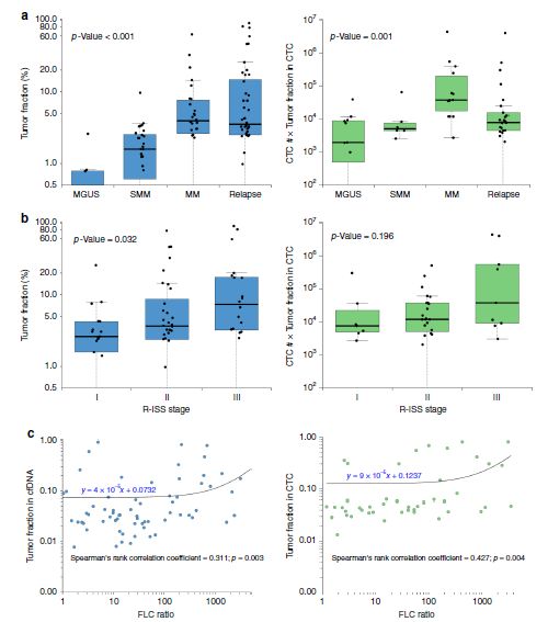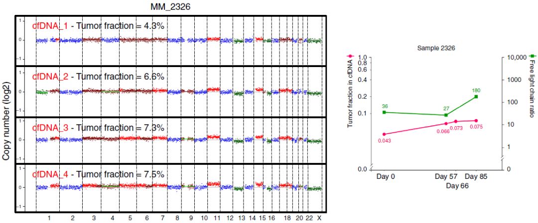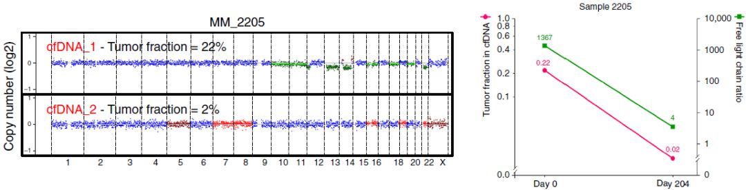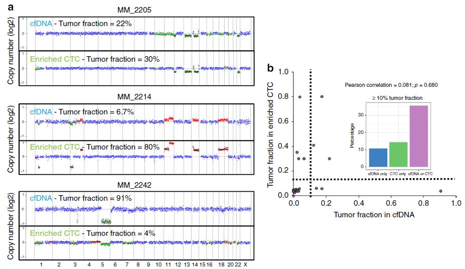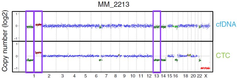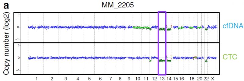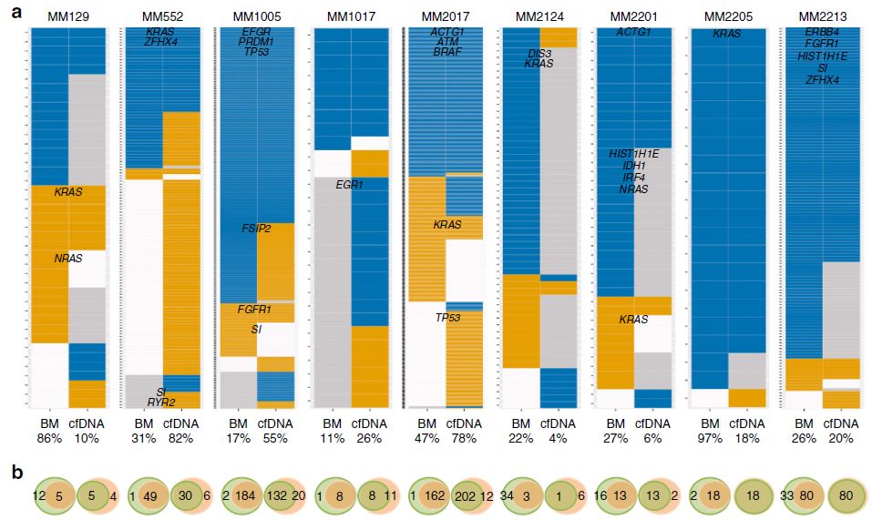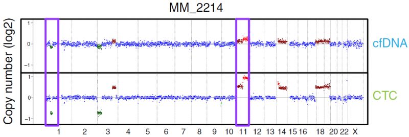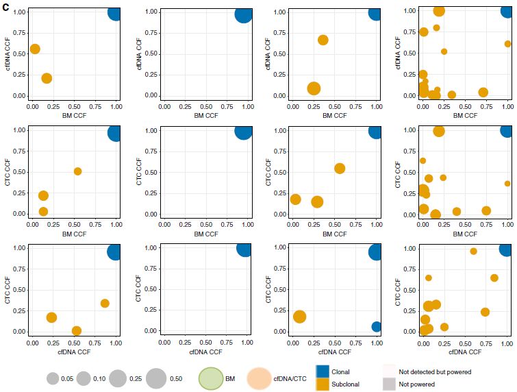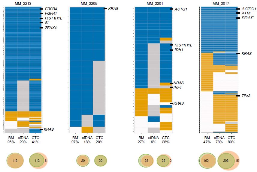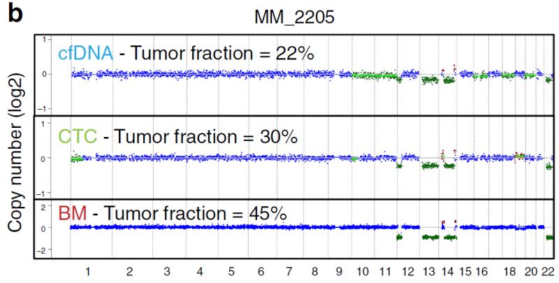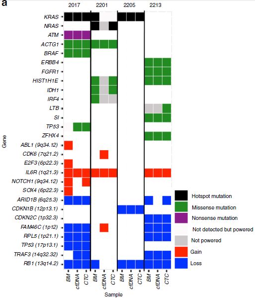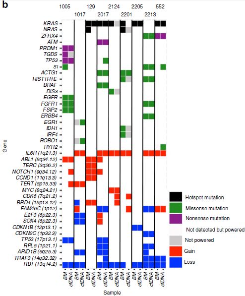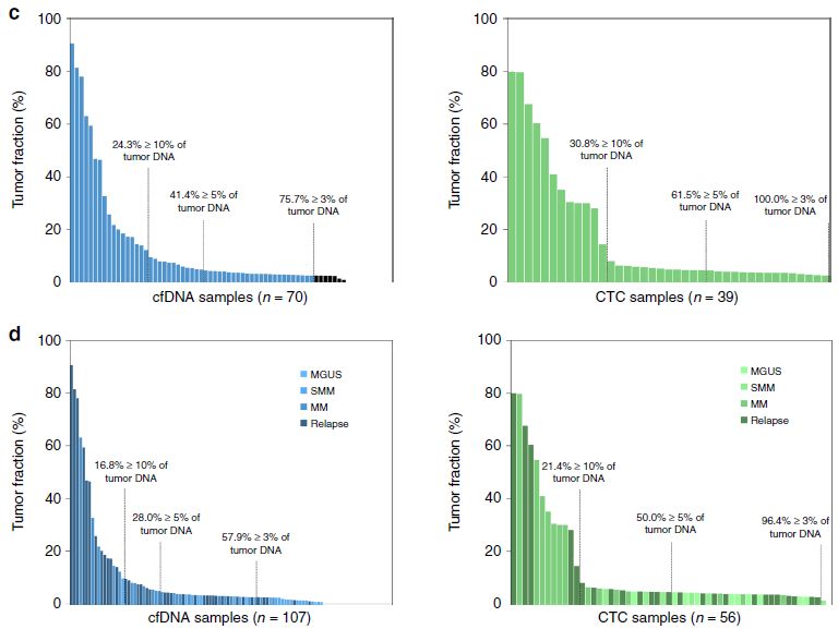 众所周知,液体活检技术正在蓬勃发展中,cfDNA和CTC检测都是比较火热的液体活检方法,那么二者间孰优孰劣呢?下面我们来看一篇Nature文献中关于多发性骨髓瘤中cfDNA和CTC检测的比较研究。 研究背景 多发性骨髓瘤(multiple myeloma,MM)是一种起源于浆细胞的血液系统恶性肿瘤,其特征表现为克隆性异常增殖的浆细胞的骨髓浸润。由癌前阶段演变为有症状的MM,由于固有的和获得性治疗抵抗而无法治愈。提升跟踪MM中克隆进化的方法有助于临床管理,越来越多的证据表明循环肿瘤细胞(circulating tumor cells,CTC)和游离DNA(cell-free DNA,cfDNA)可实现包括MM在内的癌症微创和基因组特征研究。然而,CTC和cfDNA很少在一起进行比较分析,因此CTC和cfDNA是否反映相同的肿瘤克隆以及与传统肿瘤活检的相关性如何尚不清楚。作者推断超低深度全基因组测序(ultra-low pass whole-genome sequencing,ULP-WGS)可以提供快速且经济的筛查和监测工具,以检测cfDNA和CTC中的肿瘤分数和拷贝数改变(CNA),而来自同一个MM患者相匹配的CTC、cfDNA和骨髓活检组织全外显子组测序(WES)将有助于解决上述克隆相关性和液体活检在MM患者基因组监测中的作用。 取样方法 研究结果 MM中CTC和cfDNA的可检测性 1 使用ichorCNA检测SCNA并根据ULP-WGS数据估计肿瘤分数(tumor fraction),并根据肿瘤纯度为WES选择样本。利用上述方法对疾病进展不同阶段的107个cfDNA样品和56个CTC样品进行了分析,其中包括意义未明丙种球蛋白血症(MGUS,n=9 cfDNA样品 / n=11 CTC样品)、冒烟型骨髓瘤( SMM,n=28 / n=6)、新诊断的多发性骨髓瘤MM (n=26 / n=14) 和复发性MM(n=44 / n=25)。 作者首先分析了从28位MM患者抽取的相同血液样本中匹配的cfDNA以及CTC的肿瘤分数。除MM_2205患者外,cfDNA与CTC分析得到肿瘤分数存在很大差异。Pearson相关性分析发现cfDNA与CTC分析得到肿瘤分数之间没有相关性。使用cfDNA或CTC肿瘤分数≥10%(样本进行WES的置信度百分比)时,可在35%的样本中检测到肿瘤DNA,增加一些未被单独的CTC或cfDNA检测到的样本。这表明,分析cfDNA和CTC可能会扩大液体活检对MM患者的适用性,前提是cfDNA和CTC产生相似的基因组图谱。 MM中CTC和cfDNA的临床相关性 2 为了进一步证实患者肿瘤分数的变异性以及与临床分期的潜在相关性,作者分析了来自所有患者的107个cfDNA样本和56个CTC样本。新诊断和复发性MM患者的70个cfDNA和39个CTC样本中,cfDNA样本中肿瘤分数为≥3%、5%和10%的比例分别为76%、41%和24%。相比之下,100%、62%和31%的CTC样品分别具有≥3%、5%和10%的肿瘤分数。将MGUS和SMM患者纳入cfDNA和CTC样本组中时,58%、28%和17%的cfDNA样本的肿瘤分数≥3%、5%和10%,以及96%、50%和21%的CTC样本分别具有≥3%、5%和10%的肿瘤分数,表明肿瘤分数随着疾病进展而增加,由于MGUS和SMM处于较早的临床阶段前期,MGUS和SMM患者具有低肿瘤分数。 经过Kruskal-Wallis检验,cfDNA和CTCs的肿瘤分数与疾病的临床分期显著相关。 cfDNA与修订的国际分期系统(R-ISS)和血清游离轻链比值(FLC)也有很强的相关性,而CTC仅与血清游离轻链比值相关,但与R-ISS分期无关。总之,这些结果表明液体活组检中的肿瘤分数与已知的MM生物标志物如血清游离轻链比值和R-ISS分期有很强的关联。 用cfDNA进行临床监测 3 为了确定cfDNA是否可用于追踪疾病进展或对疗法的反应,作者分析了连续取样的cfDNA样品。MM_0231患者在CD38抗体Daratumumab治疗的2个月随访期间显示疾病进展,其肿瘤分数从11%增加到46%,这与血清游离轻链比值升高正相关。MM_2323患者具有相似的变化。 而MM_2205患者对卡非佐米、雷利度胺和地塞米松具有非常好的部分应答,其cfDNA肿瘤分数从22%降低到2%。 MM_2326患者连续取样的样本检测结果是一致的,并且当患者中存在稳定的疾病负荷时相隔数周后取样可获得可重复性数据。 这4个案例强调了在将来的研究中可通过在治疗期间连续取样,使用cfDNA作为疾病应答/进展的潜在生物标志物进行监测,而骨髓活检样本由于取材不易很难实现监测。 克隆异质性的综合概况 4 为了研究cfDNA和CTC的基因组图谱的一致性,作者首先检测了ULP-WGS可检测的大片段(1 Mb)CNAs,且将重点放在肿瘤分数≥10%的样本。作者鉴定了MM_2205患者的cfDNA和CTC样品中13q拷贝数缺失,MM_2213患者中1p和13q拷贝数缺失以及1q拷贝数增加,MM_2214中1p拷贝数缺失和11q拷贝数增加。利用ULP-WGS检测匹配的cfDNA和CTC中大片段CNV,以及利用WES对tDNA(骨髓活检样本BM)检测大片段CNA,检测结果具强相关性,如下图MM_2205患者。 左右滑动查看 注:红色为拷贝数增加,绿色为拷贝数缺失,蓝色为拷贝数正常。 接下来,为下一步评估cfDNA或CTCs或两者是否可以反应MM的遗传多样性,作者对24个患者进行了WES,其中包含了9个具有匹配cfDNA和tDNA的病例以及4个具有匹配的cfDNA、CTC和tDNA的病例,并测了所有患者的胚系对照样本(WBC白细胞)。不同类型的样本的目标区域具有相似的覆盖深度,平均深度为204×。且3种类型的样本间具有相似的突变特征,克隆和亚克隆SNVs均以CpG位点的C> T转换为主,这种突变过程被报道与衰老或APOBEC(载脂蛋白B mRNA编辑酶催化多肽)有关。就克隆异质性而言,在同时具有3种类型样本的4个患者中,tDNA中99%的克隆突变被证实存在于cfDNA或CTC中。相反,在cfDNA或CTC中存在的突变仅94%在tDNA中得到证实。具有较高肿瘤纯度的CTC或cfDNA样品倾向于揭示更多突变,包含了更大比例的存在于肿瘤活组织检查中的突变。对于具有相似cfDNA和CTC肿