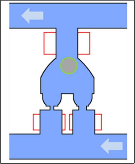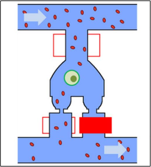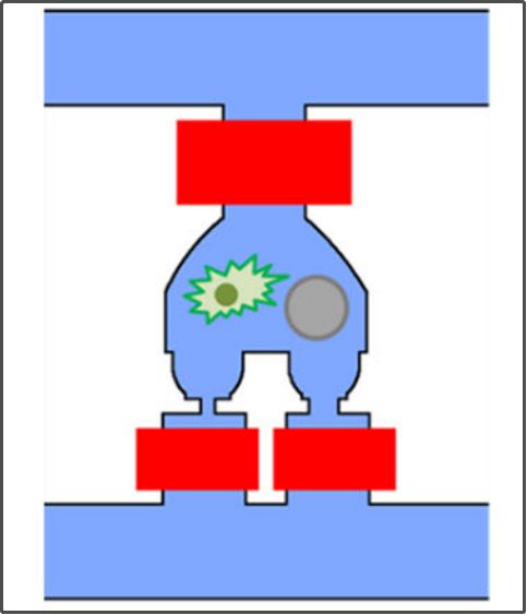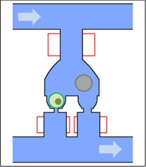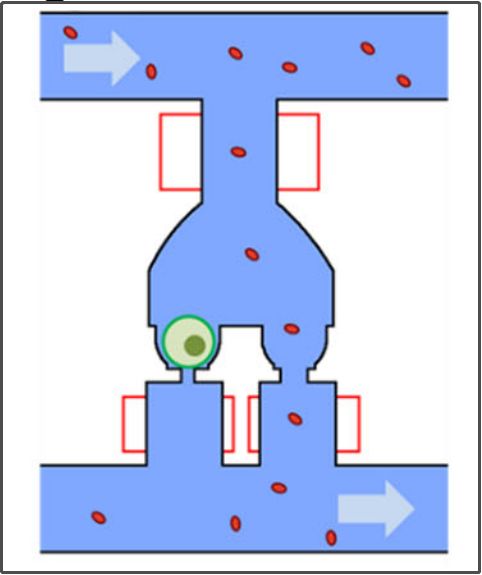 具体提纯步骤 首先加载细胞:此时,条码珠端阀门关闭,肿瘤细胞结合在捕获位点,捕获位点端阀门受到肿瘤细胞的封堵,其余细胞只能转向下游腔室,因此每个腔室内最多会有一个肿瘤细胞。 绿色那颗是肿瘤细胞,红色为血细胞 肿瘤细胞加载完毕后,条码珠端阀门开放,此时可洗除腔室内的其它血细胞。 肿瘤细胞卡在了捕获位点,并封堵了此处阀门