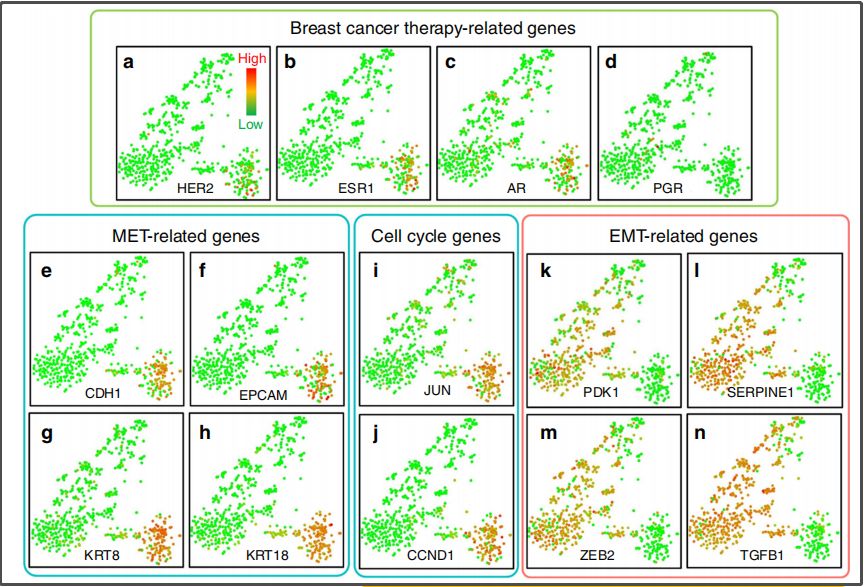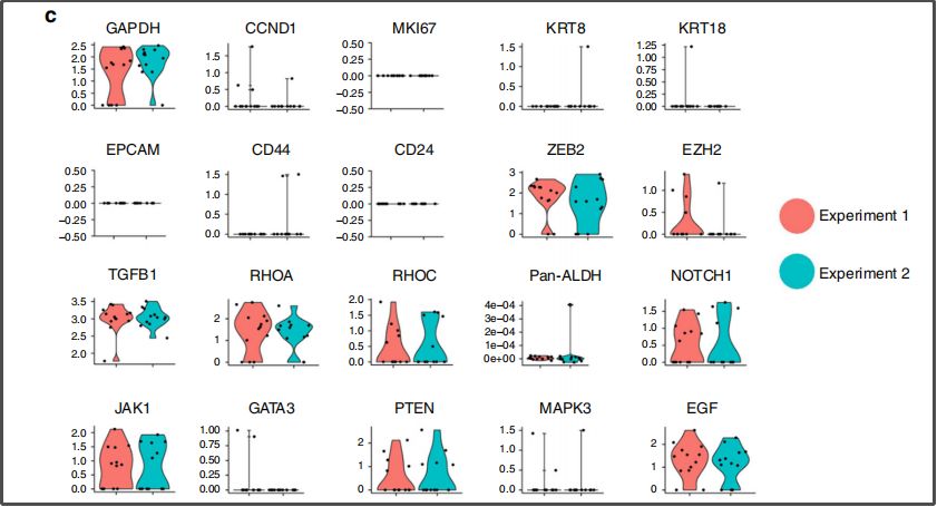 基于这项技术,研究人员对21例乳腺癌患者的666个循环肿瘤细胞进行深度分析,结果显示,即使是同一个患者,其体内不同癌细胞的表现通常也存在很大的差异。 基因分析结果 既往研究已经证实,恶性肿瘤的转移受到干细胞特性的肿瘤细胞,也就是肿瘤干细胞的诱导。需要注意的是,以往技术通过识别细胞表面蛋白从而捕获患者血液中的肿瘤细胞,但是特别容易遗漏肿瘤干细胞,因为肿瘤干细胞的表面并不会有一致的蛋白标志物。 同1例患者的重复性检测结果比较