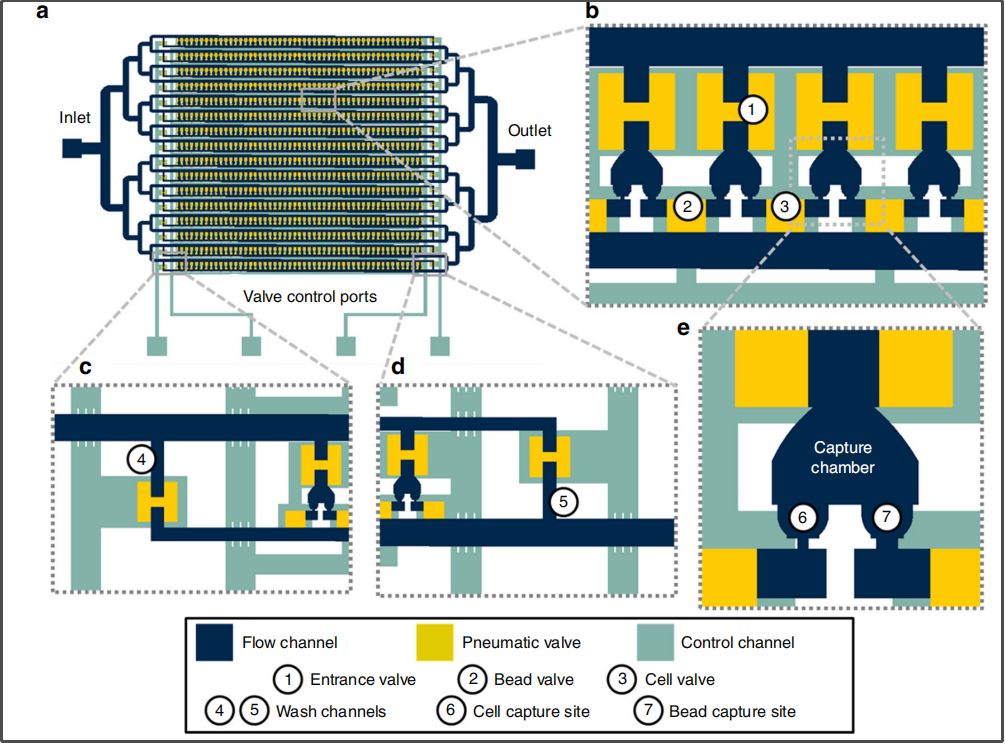 首先,研究人员根据细胞尺寸实现对肿瘤细胞的初步提取。一般而言,肿瘤细胞会比正常细胞大得多。粗提后,血细胞与循环肿瘤细胞的比例将从10亿:1浓缩至95:1。 对肿瘤细胞进行浓缩 虽然循环肿瘤细胞的纯度显著提高,但是对于详细的基因分析而言污染依旧过于严重。 然后,应用关键技术Hydro-Seq,将剩余血细胞全部过滤。 Hydro-Seq芯片由腔室以及通道系统构成。具体构造见下图,其核心单元循环肿瘤细胞捕获腔室见下图中的e。在血样流经单元腔室后,其中的循环肿瘤细胞将结合并封堵在6的位置。