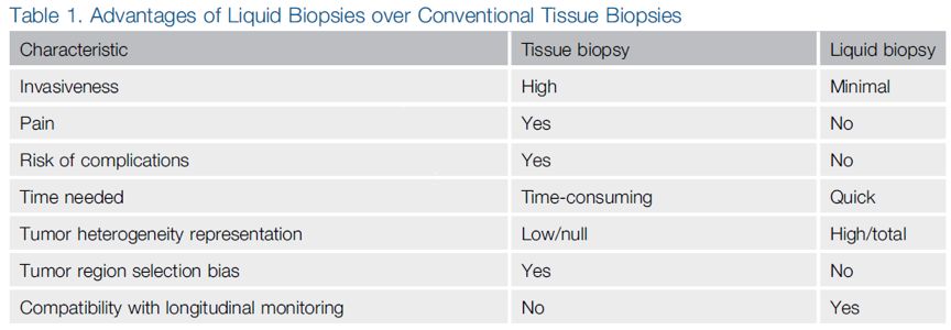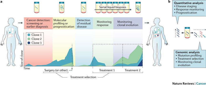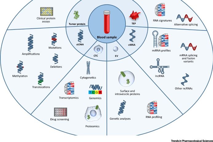 液体活检即循环肿瘤组学,是精确肿瘤学的创新领域,可以克服当前组织活检的局限性。 肿瘤循环组学中,循环肿瘤DNA(ctDNA)和循环肿瘤细胞(CTC)是美国FDA唯一批准用于指导临床应用的。 细胞外囊泡(EV),循环肿瘤RNA(ctRNA)和肿瘤教育/修饰的血小板(TEP)是相对较新的肿瘤组成成分,但在癌症治疗的每个阶段都具有很大潜力。 本文主要讨论肿瘤循环组学各成分的临床应用以及目前限制其在临床应用实施的主要因素。 液体活检:肿瘤循环组学circulome 癌症是全球死亡的主要原因之一, 2018年癌症死亡人数约为960万。2018年美国约有超过1 735 350例癌症被诊断,癌症造成超过609 640例患者死亡。 “组学”技术的发展引领了精准肿瘤领域的发展,即针对每个肿瘤患者的不同分子学特征制定个体化治疗方案。 肿瘤循环组学来自于肿瘤组织,可以直接或间接用作液体活检的肿瘤生物标志物。它包括循环肿瘤蛋白、循环肿瘤(ct)DNA、循环肿瘤细胞(CTC)、肿瘤衍生的细胞外囊泡(EV)及其成分、循环肿瘤(ct)RNA和肿瘤教育/修饰血小板(TEP)。每个成分都可提供多种生物学信息。ctDNA可检测到基因突变、缺失、基因扩增、甲基化和易位。 CTC提供丰富的基因组学、蛋白质组学、转录组学和细胞遗传学信息,并且可以离体培养以进行个性化的药物敏感性测试。 EV提供了肿瘤起源的“分子指纹”,并且其DNA、RNA和蛋白质(表面和腔内)提供了丰富的癌症生物标志物。 ctRNA,包括EV相关的循环RNA提供了不同的RNA类别。其中,miRNA表达组和长非编码(lnc)RNA表达提供定量生物标记物信息。也可定性信息,如肿瘤特异性可变剪接和基因融合的存在。癌症患者的血小板即TEP也是生物标志物,因为它们包含肿瘤衍生的RNA和肿瘤诱导的可变剪接的转录子。 目前肿瘤遗传谱分析的金标准仍是组织活检。鉴于其侵入性,组织活检具有许多局限性,如患者手术风险、样品制备、灵敏度和准确性、手术成本和侵入性。这使得组织活检无法应用于临床患者纵向监测。此外,组织活检的最大局限性在于无法捕获肿瘤内和转移病灶间的遗传异质性,影响了检测的准确性。 液体活检可以克服组织活检的局限性。可应用于临床癌症的诊断、筛查和预后。本文详细介绍了液体活检的临床意义和应用潜力,并汇总了肿瘤循环组学作为癌症诊断和监测的生物标志物的最新文献报道。特别是ctDNA、CTC、肿瘤衍生的EVs和ctRNA。 本文还讨论了循环肿瘤组学在临床实践中的限制因素,并概述了克服这些因素的重大技术进展。