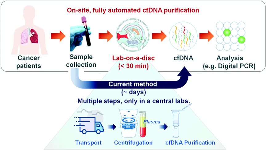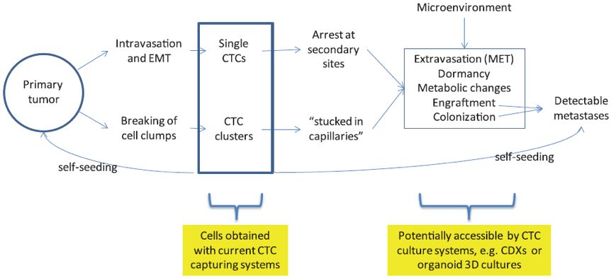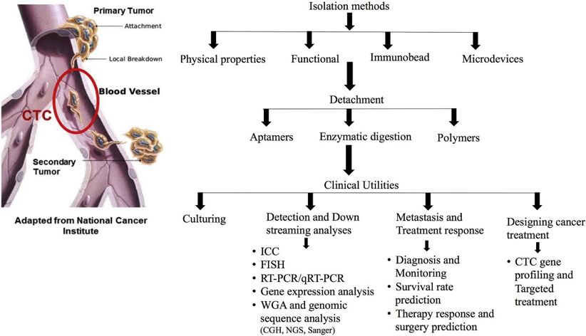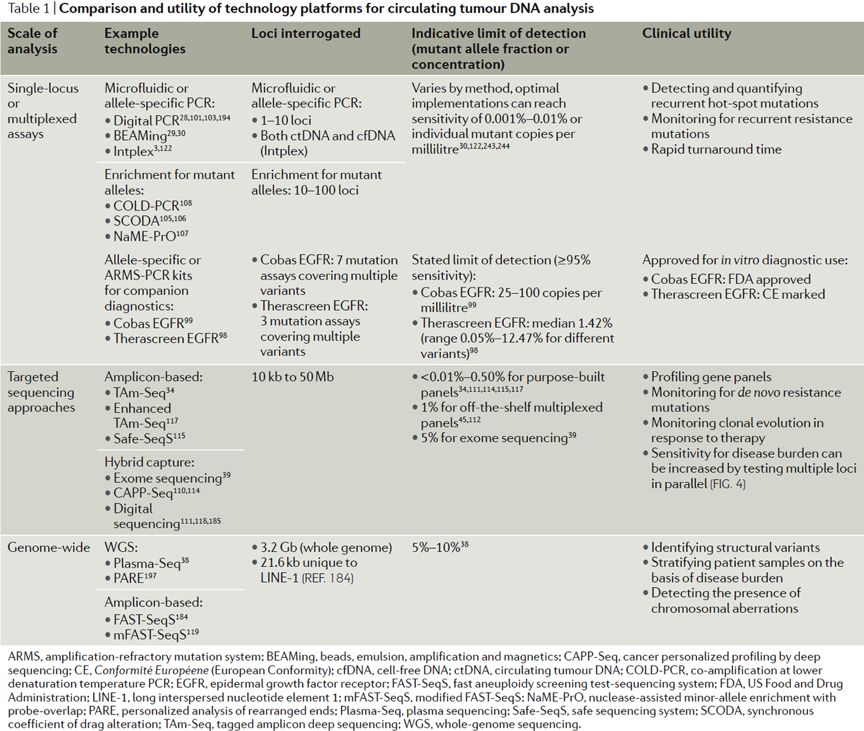循环肿瘤DNA ctDNA是指来自肿瘤细胞的游离DNA,肿瘤通过细胞凋亡、坏死、CTC溶解以及分泌(外泌体)到血液中。 ctDNA的临床意义 ctDNA可提供定性和定量信息。 定量信息,即突变等位基因比(MAF,靶基因突变等位基因的百分比)的测量中获得,表示肿瘤负荷。可用于检测微小残留病(MRD)和隐匿性转移以及监测治疗反应和治疗效果。ctDNA水平提供肿瘤体积的“实时”快照,因为crDNA的半衰期短(~2.5 h)。 ctDNA是治疗后监测疾病复发的高灵敏度和高特异性预测因子。 定性信息,即分析ctDNA中的突变,扩增,缺失和易位等遗传信息的改变,从而指导个性化治疗方案的制定。例如,FDA批准的第一个基于ctDNA的伴随诊断(cobas®EGFRMutation Test v2; Roche Diagnostics)用于指导EGFR敏感突变的NSCLC患者EGFR-TKI的使用。也可分析ctDNA甲基化状态。例如,美国FDA批准了结直肠癌(CRC)的筛查检测,用于检测SEPT9基因启动子的甲基化。 技术方法和限制 目前ctDNA检测常用方法有PCR或新一代测序(NGS)。 等位基因特异性PCR是ctDNA检测使用的第一种方法,cobas®EGFR技术采用的的定量PCR(qPCR)。总cfDNA中ctDNA的占比非常低,通常<0.01%。目前已开发出高敏感度技术并成功用于ctDNA分析,如数字PCR(dPCR)、液滴数字PCR( ddPCR)、珠子乳剂扩增磁性(BEAMing)技术。 虽然这些技术灵敏度高、检测快速且相对便宜,但基于PCR的技术受到低通量的限制,只能分析有限数量的基因位点。 NGS技术的灵敏度低于PCR技术,并且灵敏度与与分析的基因位点数成反比,全外显子组测序(WES)具有最低的灵敏度(≥5%MAF)。增强NGS敏感性的方法可以考虑患者或癌症特异性基因组,例如通过深度测序(CAPP-Seq)技术进行癌症个性化分析,或在文库制备期间抑制由随机错误产生的背景噪音,这些方法需使用独特的分子标签(UMI)标记每个模板。不同的NGS平台均在使用上述方法,例如增强型标记扩增子测序(eTAm-Seq™)。 增强灵敏度的另一种方法是使用选择性核酸酶消化非突变DNA,这导至MAF增加并可检测低至0.00003%MAF的突变。 尽管ctDNA应用于液体活检具有潜力,但仍具有许多局限性。检测灵敏度是最严重的问题,特别是在早期癌症检测中,ctDNA含量低可能导至MAF低于现有技术的检测限。此时,其他体液如接近肿瘤推定部位的取样可以提高检测率,尤其是具有遗传易感基因的高危个体的检测。因为在肿瘤早期阶段,近端体液中可能比血液具有更高浓度的肿瘤衍生DNA。早期检测的另一个应用是单个或小组突变的预测作用,因为在健康个体的血浆中仍可发现癌症相关突变,这是克隆性造血导至的。应用CancerSEEK平台可避免该问题,该平台将8种肿瘤衍生蛋白与ctDNA突变谱相关联,其特异性> 99%。 另一个限制ctDNA在临床实践中应用的问题缺乏用于分析前样品制备和ctDNA纯化的标准化方案。目前的操作程序复杂并可能导至ctDNA降解和血细胞溶解。 急需一种快速、一步纯化ctDNA的平台,芯片实验室系统有可能满足这一需求。 循环肿瘤细胞 CTC是从原发肿瘤部位分离出的肿瘤细胞群,可在患者的外周血中检测到。CTC被认为是肿瘤转移发展的基础[31]。 CTC通过主动内渗、上皮-间质转化(EMT)或者或原发肿瘤被动脱落达到血液中。血液中CTC聚集体或循环肿瘤微栓子(CTM)证明了后一种机制。 CTC的临床意义及分析技术 CTC可提供定量信息以及单细胞基因组、转录组学和/或蛋白质组学(定性)信息。 CTC可用于诊断、监测、预后和疗效预测,也可用于发掘具有应用潜力的新药物靶点。 此外,离体培养CTC具有重要的翻译价值,可利用CTC进行个性化的药物敏感性测试,根据肿瘤突变谱和药物敏感性结果指导个体化治疗决策。 CTC的数量是许多癌症的预后预测因子,包括转移性乳腺癌、结肠癌和前列腺癌。 目前FDA唯一批准CellSearch®平台用于CTC临床应用,用于上皮CTC的计数。 METABREAST试验(clinicaltrials.gov标识符:NCT01710605)正在研究CTC作为转移性乳腺癌患者的一线治疗的选择标准。 ctDNA分析技术可用于CTC分析,从而获得遗传和基因组信息,包括qPCR和基于dPCR的突变分析以及靶向NGS和全基因组测序。此外,CTC可用于细胞遗传学分析,如荧光原位杂交(FISH),用于鉴定染色体重排。 NGS技术在单CTC基因组和转录组学表征、肿瘤异质性研究以及组织活检的比较分析中具有重要应用。单细胞基因组学和转录组学已取得显着发展,但使用单一的免疫组织化学和流式细胞术进行单CTC蛋白质分析有些为时过早。新技术正在开发,如Sinkala及其同事最近开发了一种基于微流体的scWB技术,可评估单个CTC中的8种蛋白质。 尽管有许多分析平台和技术可用于CTC分析,但在临床实践中的应用仍受到血液分离的限制。存在的挑战还包括CTC细胞的极端稀有性、脆弱性、物理和表型异质性。 目前CTC的富集和分离主要利用其生物和物理特性,而功能测定可用于CTC鉴定。每一种方案都有其优点和缺点,不同方法的组合才能获得更全面的表征。 (未完待续)