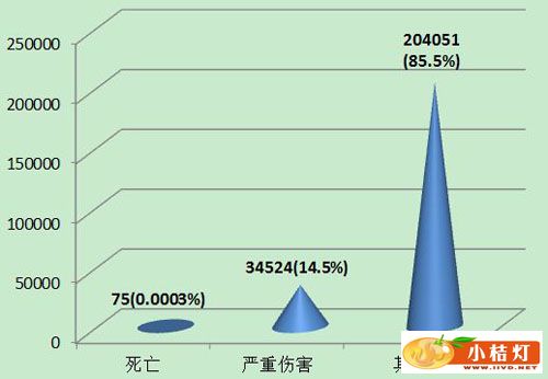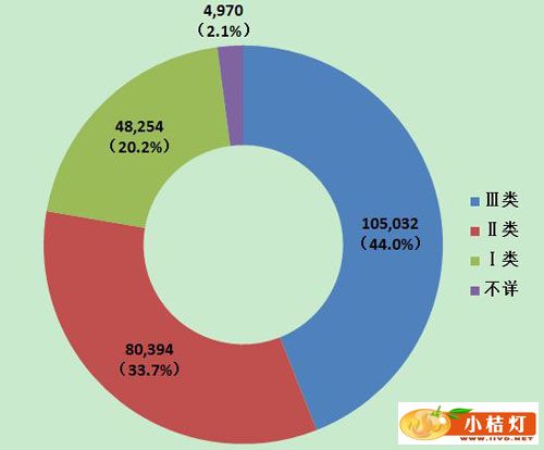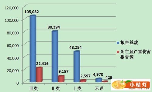 (二)2002年至2013年全国可疑不良事件报告总数量 2002年1月1日至2013年12月31日,国家药品不良反应监测中心累计收到《可疑医疗器械不良事件报告表》735,559份(图5)。![]() 图5 2002-2013年全国可疑医疗器械不良事件报告数量 (一)按报告来源统计分析 2013年医疗器械不良事件报告中,使用单位上报175,317份,占报告总数的73.5%;生产企业上报7,274份,占报告总数的3.1%;经营企业上报52,736份,占报告总数的22.1%;还有3,323份报告来自于个人,占报告总数的1.4%(图6)。 ![]() 图6 2013年医疗器械不良事件报告来源 2013年,注册基层用户数量达到148,585,比2012年增加71.4%。但上报不良事件报告的单位所占比例与去年基本持平。在所有注册的基层用户中,仅有21.2%的用户提交过不良事件报告。其中,经营企业的上报比例最低,注册的61,498家用户中有9,576家提交了报告,仅占15.6%;生产企业注册的8,495家用户中有2,594家提交了报告,占30.5%;使用单位注册的78,592家用户中有19,335家提交了报告,占24.6%。尽管注册基层用户的数量大幅增加,但用户提交报告比例偏低,提示对基层用户的宣传培训、督促检查工作还需要进一步加强(图7)。 ![]() 图7 2013年注册基层用户提交报告情况 2013年可疑医疗器械不良事件报告中,事件伤害为死亡的报告共75份,占总报告数的0.0003%;事件伤害为严重伤害的报告34,524份,占总报告数的14.5%;事件伤害为其他的报告共204,051份,占总报告数的85.5%(图8)。 ![]() 图8 2013年医疗器械不良事件报告事件伤害程度情况 ![]() 图9 2009-2013年全国报告数量与死亡及严重伤害报告数量比较 2013年医疗器械不良事件报告中,涉及Ⅲ类医疗器械的报告最多,共105,032份(其中死亡及严重伤害事件报告22,416份),占总报告数的44.0%;涉及Ⅱ类医疗器械的报告次之,共80,394份(其中死亡及严重伤害事件报告9,157份),占总报告数的33.7%;涉及Ⅰ类器械的报告最少,共48,254份(其中死亡及严重伤害事件报告2,597份),占总报告数的20.2%;部分报告涉及的器械管理类别不详,共4,970份报告(其中死亡及严重伤害事件报告429份),占报告总数的2.1%。Ⅱ类、Ⅲ类医疗器械的报告是构成主体,与医疗器械风险程度高低相吻合(图10,图11)。 ![]() 图10 2013年医疗器械不良事件报告涉及产品管理类别情况 ![]() 图11 2013年死亡及严重伤害医疗器械不良事件报告涉及产品管理类别情况 按照现行的《医疗器械分类目录》,2013年的可疑医疗器械不良事件报告共涉及43类产品(除产品分类不详或未填写等其他外),涵盖了《医疗器械分类目录》中的所有医疗器械类别。其中,报告数量位列前十位的产品类别依次为医用高分子材料及制品,注射穿刺器械,医用卫生材料及敷料,植入材料和人工器官,物理治疗设备,医用光学器具、仪器及内窥镜设备,普通诊察器械,医用电子仪器设备,手术室、急救室、诊疗室设备及器具和医用缝合材料及粘合剂。与2012年相比,报告数量位列前十位的产品类别完全相同,仅排名略有变化(表2)。 表2 2013年医疗器械不良事件报告涉及产品分类目录情况