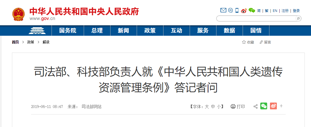 2019年5月28日,国务院总理李克强签署第717号国务院令,公布《中华人民共和国人类遗传资源管理条例》(以下简称《条例》)。《条例》自2019年7月1日起施行。日前,司法部、科技部的负责人就《条例》有关问题回答了记者提问。 问:请简要介绍一下《条例》制定的背景和过程? 答:我国是多民族的人口大国,具有独特的人类遗传资源优势,拥有丰富的特色健康长寿人群、特殊生态环境人群(如高原地区)、地理隔离人群(如海岛人群)以及疾病核心家系等遗传资源,为发展生命科学和相关产业提供了得天独厚的条件。我国历来高度重视人类遗传资源的保护和利用工作,1998年国务院办公厅转发科技部、卫生部联合制定的《人类遗传资源管理暂行办法》,对有效保护和合理利用我国人类遗传资源发挥了积极作用。但是,随着形势发展,我国人类遗传资源管理出现了一些新情况、新问题:人类遗传资源非法外流不断发生;人类遗传资源的利用不够规范、缺乏统筹;利用我国人类遗传资源开展国际合作科学研究的有关制度不够完善;暂行办法也存在对利用人类遗传资源的规范不够、法律责任不够完备、监管措施需要进一步完善等问题。为解决实践中出现的突出问题,促进我国人类遗传资源的有效保护和合理利用,有必要在总结暂行办法施行经验的基础上制定《条例》。 2016年1月,科技部向国务院报送了《人类遗传资源管理条例(送审稿)》。原国务院法制办收到此件后,先后两次征求有关部门、地方政府、科研机构、企业、专家学者的意见,并向社会公开征求意见;赴地方调研,召开专家研讨会,会同科技部对送审稿进行了反复研究修改,形成了《中华人民共和国人类遗传资源管理条例(草案)》。“基因编辑婴儿”事件发生后,司法部会同科技部又根据最新形势变化,对草案作了进一步修改完善。2019年5月28日,李克强总理签署国务院令,正式公布《条例》。 问:《条例》在加强我国人类遗传资源保护方面采取了哪些措施? 答:为了有效保护我国人类遗传资源,《条例》规定:一是国家加大对我国人类遗传资源的保护力度,开展人类遗传资源调查,对重要遗传家系和特定地区人类遗传资源实行申报登记制度。二是外国组织、个人及其设立或者实际控制的机构需要利用我国人类遗传资源开展科学研究活动的,采取与我国科研机构、高等学校、医疗机构、企业合作的方式进行。三是将人类遗传资源信息对外提供或或者开放使用,实行备案并提交信息备份;可能影响我国公众健康、国家安全和社会公共利益的,应当通过国务院科学技术行政部门组织的安全审查。 问:《条例》在促进合理利用我国人类遗传资源方面作了哪些规定? 答:为了促进合理利用我国人类遗传资源,《条例》规定:一是国家支持合理利用人类遗传资源开展科学研究、发展生物医药产业、提高诊疗技术,提高我国生物安全保障能力,提升人民健康保障水平。二是国家人类遗传资源保藏基础平台和数据库应当依照国家有关规定向有关科研机构、高等学校、医疗机构、企业开放。三是省级以上人民政府科学技术行政部门应当会同本级人民政府有关部门对利用人类遗传资源开展科学研究、发展生物医药产业统筹规划,合理布局,加强创新体系建设,促进生物科技和产业创新、协调发展。四是国家鼓励科研机构、高等学校、医疗机构、企业利用人类遗传资源开展研究开发活动,对其研究开发活动以及成果的产业化依照法律、行政法规和国家有关规定予以支持;鼓励利用我国人类遗传资源开展国际合作科学研究,提升相关研究开发能力和水平。 问:《条例》在规范采集、保藏、利用、对外提供人类遗传资源等活动方面作了哪些规定? 答:为了规范采集、保藏、利用、对外提供人类遗传资源等活动,《条例》规定:一是采集、保藏、利用、对外提供我国人类遗传资源不得危害我国公众健康、国家安全和社会公共利益,要符合伦理原则,保护资源提供者的合法权益,遵守相应的技术规范。禁止买卖人类遗传资源,为科学研究依法提供或者使用人类遗传资源并支付或者收取合理成本费用,不视为买卖。二是开展生物技术研究开发活动或者开展临床试验的,应当遵守有关生物技术研究、临床应用管理法律、行政法规和国家有关规定。三是保留暂行办法中对采集、保藏我国人类遗传资源、利用我国人类遗传资源开展国际合作科学研究和人类遗传资源材料出境的审批,并明确审批条件、完善审批程序。 问:《条例》在优化服务监管方面采取了哪些措施? 答:为了优化服务监管,《条例》规定:一是国务院科学技术行政部门和省、自治区、直辖市人民政府科学技术行政部门应当加强对采集、保藏、利用、对外提供人类遗传资源活动各环节的监督检查,发现违反本条例规定的,及时依法予以处理并向社会公布检查、处理结果。二是国务院科学技术行政部门应当加强电子政务建设,方便申请人利用互联网办理审批、备案等事项;制定并及时发布有关采集、保藏、利用、对外提供我国人类遗传资源的审批指南和示范文本,加强对申请人办理有关审批、备案事项的指导。三是完善法律责任,加大了处罚力度。 问:条例在加强涉及“基因编辑”的生命科学研究、医疗活动监管方面将发挥什么作用,是否还要制定其他行政法规? 答:《条例》重在保护我国人