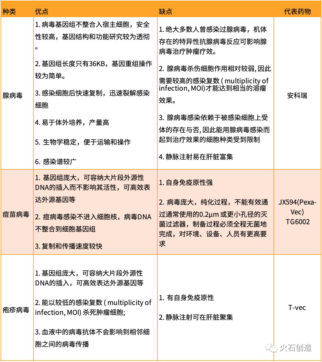 五、我国溶瘤病毒产业发展面临挑战 1. 溶瘤病毒给药途径限制其临床应用 目前,溶瘤病毒以瘤内注射为主,多于用体表肿瘤或部位局限肿瘤,限制了其临床应用范畴。系统性给药(如静脉注射)更有临床应用前景和商业价值,有望治疗转移性肿瘤或血液肿瘤。 但静脉给药存在易被血液稀释,降低裂解肿瘤细胞的疗效;易被循环血液的成分干扰,导至溶瘤病毒失效或被快速清除;易引起全身扩散,导至严重的非靶向性感染等缺点。 2. 溶瘤病毒的上游创新环节面临挑战 病毒种类和功能基因的选择及改造是溶瘤病毒的源头创新环节,但溶瘤病毒常用的病毒种类和插入的功能基因已被大量科研文献广泛发表,这对于溶瘤项目的创新性和专利壁垒会产生相关挑战。 3. 溶瘤病毒产业化应用仍任重道远 溶瘤病毒制备技术基本成熟,但大规模产业化依然有待解决,临床应用级别的病毒载体工业化生产面临多个挑战: (1)缺乏高灵敏度的活性病毒 GMP 工业生产的质控检测体系;(2)目前仍没有针对临床使用溶瘤病毒的制造和表征的具体监管指南;(3)传统用于实验室目的的贴壁细胞系统在规模放大中会面临很多困难;(4)病毒纯化耗时长,生产成本高等。 参考资料: [1] 黄慧雅, 陆荫英, 谢震. 溶瘤病毒在肿瘤治疗中的研究进展[J]. 传染病信息, 2019(1). [2]高特佳.溶瘤病毒投资的机遇与挑战[EB/OL].[2019-06-23].https://www.sohu.com/a/239089508_550637. [3] 浙商证券. 溶瘤病毒-肿瘤治疗新希望,潜力巨大新技术[EB/OL].[2019-06-23].https://www.docin.com/p-1665831053.html. [4] 医麦客.溶瘤病毒:基因治疗时代的宠儿,实体瘤攻克的利器[EB/OL].https://med.sina.com/article_detail_103_2_51332.html. —END— 作者 | 火石研究院 责编 | 老姜 |