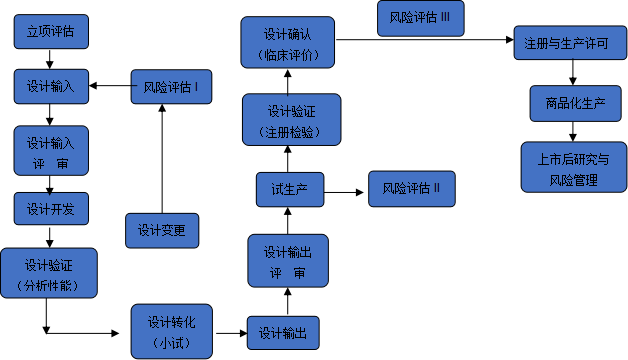 ISO9001质量管理中,对于产品的实现过程有一个模式图,即大家非常熟悉的客户需求输入——产品实现——客户要求满足,但IVD产品具有法规的特殊要求,因此我们可以理解为各方需求输入,通过产品实现过程输出IVD产品,以满足输入要求,IVD产品的基本实现流程如下:(可以根据情况合理增减流程节点)