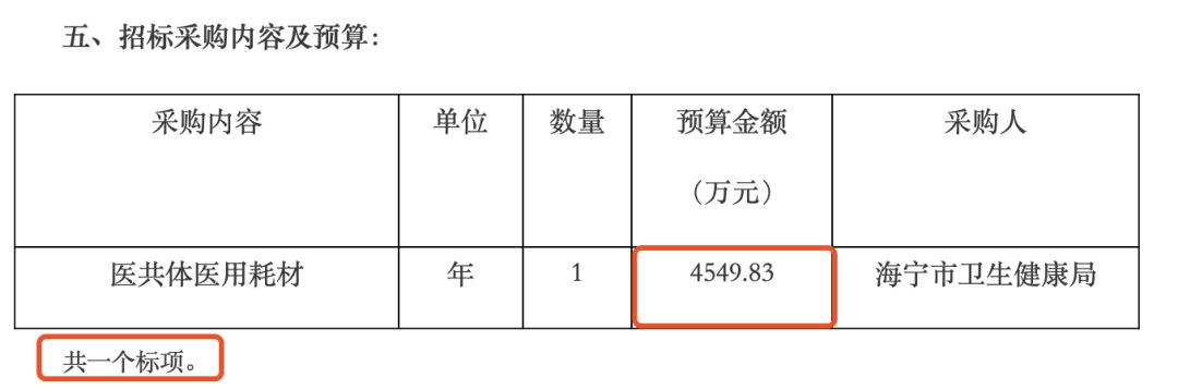 《公告》里明确指出,本次项目是由海宁市卫健局统计汇总各公立医疗机构(海宁市第二人民医院除外)带量采购的医用耗材目录、价格和年采购数量,对带量采购的医用耗材打包进行招标。