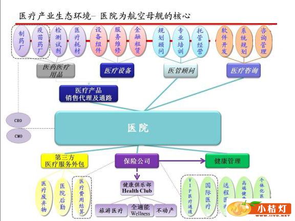 医疗产业生态环境——医院为航空母舰核心。有众多子系统:医疗设备、制药、药品流通、耗材、疫苗、医管顾问、医疗信息系统、诊断试剂、CRO/CMO、第三方外包服务(后勤)、第三方管理TPA、健康保险、医疗金融、医养结合地产、健康管理、远程医疗等等,其中医院处于核心。