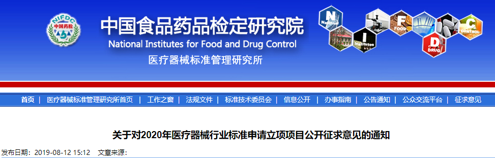 为进一步做好2020年医疗器械行业标准立项工作,经研究,现对各医疗器械标准化(分)技术委员会或技术归口单位上报的2020年医疗器械行业标准申请立项项目(见附件1)公开征求意见。征求意见截止时间为2019年9月13日。请填写意见回复表(附件2)发送至电子邮箱:zhb-xbs@nifdc.org.cn