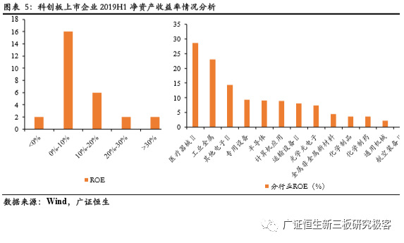 营业收入方面,已发行的28家企业2019H1营业总收入中位数为2.97亿元,同比增长率中位数达38.28%。收入最高的企业未中国通号(20.51亿元),最低者为新光光电(6145.16万元)。其中,16家企业2019H1营收收入在0-5亿元区间,3家企业营业收入超10亿元。相比2018年全年,2019H1科创板企业营收情况转好,全部企业实现营业收入正增长。分板块对比,科创板营业收入增长明显快于主板、中小板、创业板上市企业。 净利润方面, 2019H1已上市的科创板企业平均归母净利润中位数为6,563.48万元,同比增长率达35.59%。相比2018年,2019H1净利润同比增长率为负的企业增加,但相对主板、中小板创业板而言,科创板的净利润增长更快。 从研发投入的角度看,2019H1已上市科创板企业平均研发投入达6758.05 万元,中位数为3,506.38万元,中国通号、晶晨股份、澜起科技、中微公司研发费用超亿元,研发强度达12%,大幅高于其他板块。 从盈利能力的角度看,2019H1,28家上市企业ROE平均数为10.32%,中位数为8.47%。目前较多企业净资产收益率集中在0-20%区间内。行业方面,目前医疗器械、工业金属和其他电子II行业的ROE高于10%,其他行业如专用设备半导体表现也表现良好,化学制药制品、通用机械、航空装备ⅡROE相对较低。