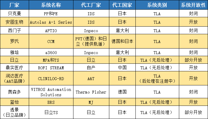 上游代工的主要公司有日本IDS公司、意大利Inpeco公司、德国PVT公司(后期被罗氏收购),日本A&T公司日立公司,此外,还有MJ公司、Thermo公司等代工厂家。