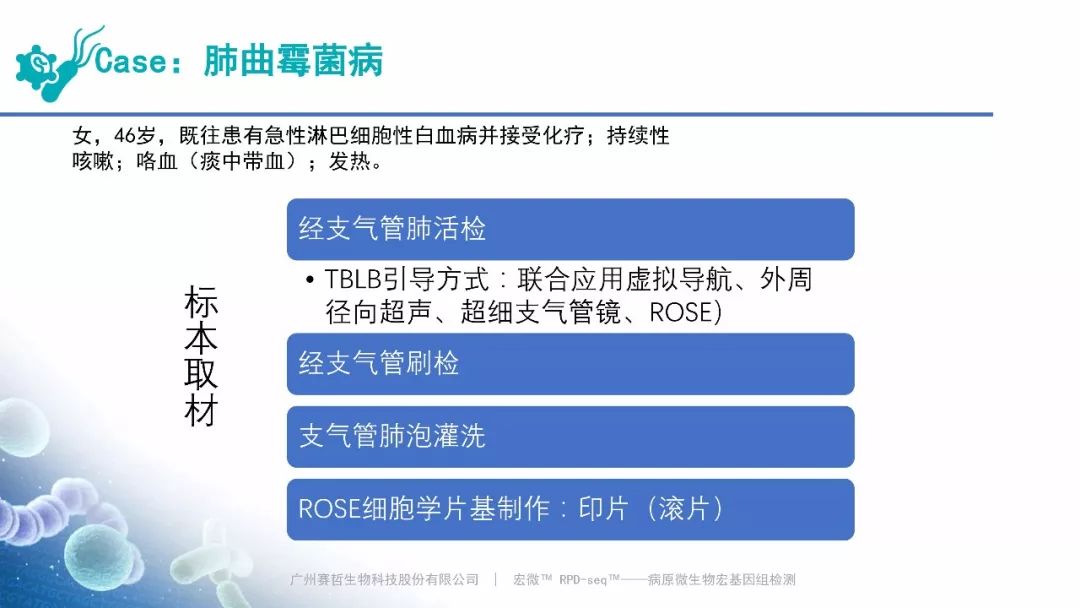 Case:病毒性肺炎,赛哲特异性检出 RNA病毒:人副流感病毒 3型(滑动图片) Case:肺曲霉菌病,赛哲特异性检出曲霉(滑动图片)