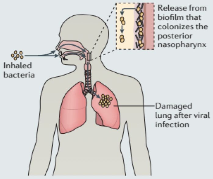 流感感染后合并细菌感染的机制 主要机制:1、上呼吸道定植菌迁移至下呼吸道。2、外界的细菌吸入。 细菌感染后加重炎症反应 所以我们也经常讲,感染流感病毒之后,就像打开一个扳机一样,把呼吸道闸门打开了,这时各种病毒、细菌都可能会进入到我们体内,而造成继发的感染。