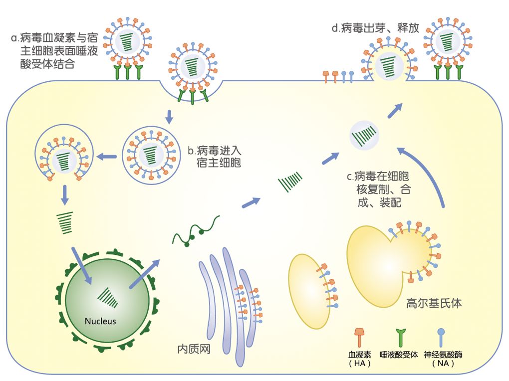 看看流感的发病机制 甲、乙型流感病毒通过血凝素(HA)与呼吸道上皮细胞表面的唾液酸受体结合启动感染。流感病毒通过细胞内吞作用进入宿主细胞。病毒基因组在细胞核内进行转录和复制,复制出大量新的子代病毒。病毒出芽、释放,感染其他细胞。