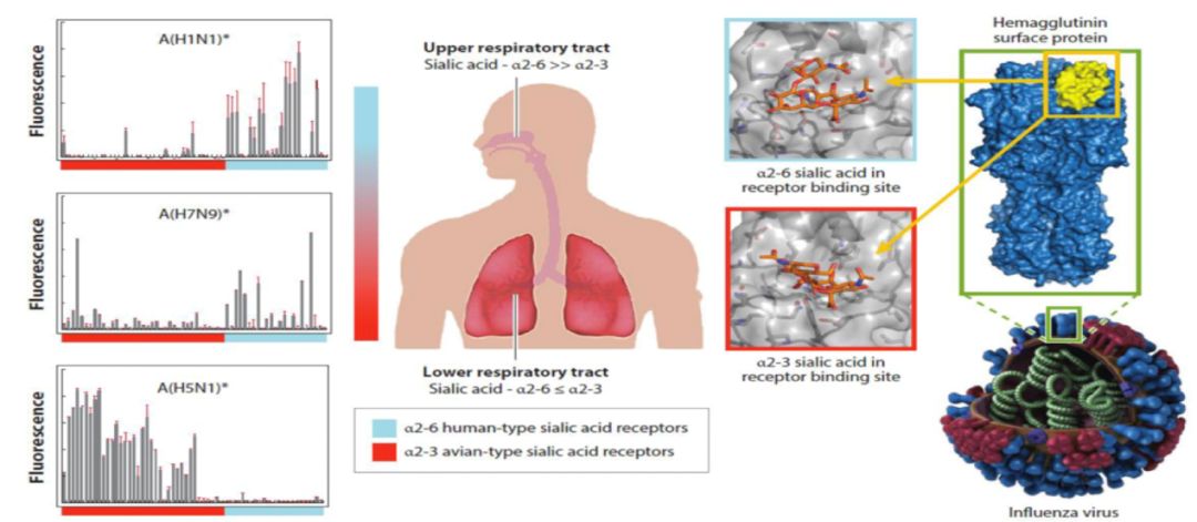 流感病毒在人类呼吸道的结合位点 大家可能还会发现,感染H1N1、H3N2时症状多表现在上呼吸道,而如果感染了禽流感,则是下呼吸道症状明显。H7N9、H5N1的受体主要是α2-3,在下呼吸道,这可能就是它很少感染人,而一旦感染往往常表现为肺炎的原因。