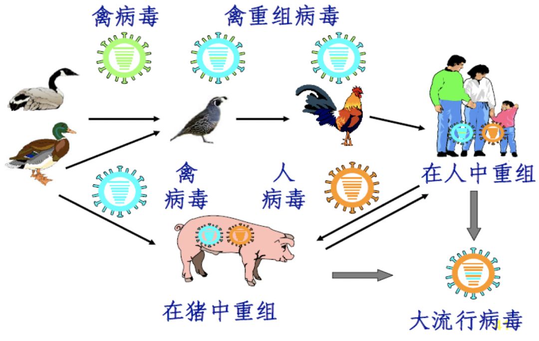 导至大流行的禽-人重组病毒的产生 还有一个值得担心的问题,流感病毒中的16个H、9个N可能组合出很多结果,RNA病毒在复制的过程中缺乏校正酶,很容易发生变异,如果禽流感病毒发生抗原性转移, 具备了人间传播的能力,它就可能变成「人传人」的新病毒亚型,可能对人类造成很大的危害,甚至会成为造成大流行的病毒。