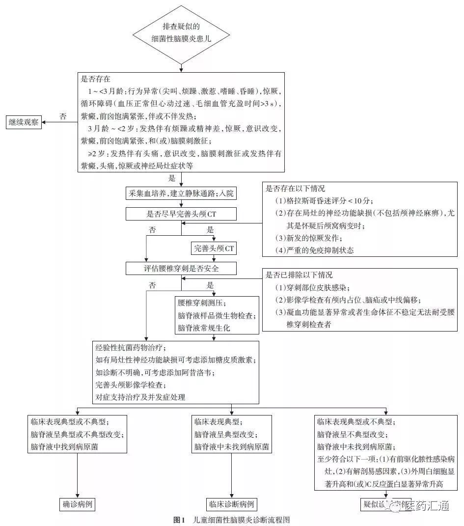 诊断流程 对于临床怀疑细菌性脑膜炎患儿,按图1流程诊断评估。 抗菌药物治疗 1. 抗菌药物开始使用的时机 疑似细菌性脑膜炎时,建议入院后1 h内静脉应用足剂量、易透过血脑屏障、具有杀菌作用的抗菌药物。特别强调及时完成血和脑脊液培养;如果有任何原因使腰椎穿刺延迟,包括影像学检查,即使尚未明确诊断,在行血培养后,对疑似患儿也应立即开始经验性抗菌药物治疗。 2. 抗菌药物的初始经验治疗和调整 抗菌药物的选择要从患儿年龄、细菌入颅途径、颅外感染灶、该地区脑膜炎常见细菌谱几个方面综合判断可能的致病细菌,并考虑这些社区获得细菌的耐药情况,作出合理选择,经验性治疗阶段可联合应用抗菌药物。 考虑到我国肺炎链球菌常见,该菌脑膜炎型的青霉素和头孢菌素药敏折点高,脑膜炎型菌株对青霉素和三代头孢的耐药率高,建议将三代头孢菌素加万古霉素作为初始经验治疗方案。 对头孢菌素过敏患儿,经验性治疗阶段需兼顾其他细菌,可选用美罗培南替代治疗。 大肠埃希菌是婴儿期细菌性脑膜炎常见病原菌,耐药现象普遍,关于大肠埃希菌脑膜炎的经验性治疗,尚没有统一的意见。欧美指南推荐使用三代头孢或美罗培南,也有建议三代头孢联合使用氨基糖苷类抗菌药物。 当考虑为高耐药性大肠埃希菌感染时,可选择三代头孢联合美罗培南作为初始治疗方案。 一旦得到脑脊液革兰染色或培养结果,应根据病原体药敏结果结合经验治疗效果调整抗菌药物(表1,表2)。 注:具体用药需要参照药敏结果;部分药物涉及超说明书使用,使用前应充分告知;李斯特菌考虑单药效果不好时,可根据临床需要考虑添加氨基糖苷类抗菌药物;针对大肠埃希菌以及无乳链球菌,可根据临床需要考虑添加氨基糖苷类抗菌药物;鉴于氨基糖苷类抗菌药物的耳毒性等不良反应,应谨慎使用,尤其是4岁以下的儿童,更应严格掌握适应证,密切监测不良反应,并根据现有的医疗规章制度予以充分告知;利福平、复方新诺明和磷霉素不建议作为单药治疗;氯霉素、喹诺酮类可作为耐药性肺炎链球菌、脑膜炎球菌、流感嗜血杆菌等病原菌的替代治疗方案,但鉴于其不良反应以及超说明书应用等情况,应尽量避免使用;如肺炎链球菌对头孢曲松或头孢噻肟高耐药,即最低抑菌浓度≥4.0 mg/L,可考虑加利福平;对耐甲氧西林的葡萄球菌脑膜炎,选择万古霉素时,可考虑加用利福平。 表2 3. 抗菌药物的疗程 对所有细菌性脑膜炎患儿均应坚持足疗程的抗菌药物治疗,推荐疗程见表1。当致病菌不明确时,结合临床疗效建议至少治疗2周。 足疗程治疗后效果不满意者,应分析原因,注意排查其他部位病灶及并发症,视情况决定是否延长抗菌药物疗程或调整治疗方案。 4. 停药指征 目前细菌性脑膜炎没有明确的停药指征,现有的停药建议大多基于临床经验。根据国内外研究现状结合我国实际情况建议,按标准疗程完成治疗并满足以下条件可停用抗菌药物:症状体征消失、体温正常1周以上,脑脊液压力、细胞数低于20个且均为单个核细胞、蛋白和糖正常,脑脊液培养阴性,没有神经系统并发症。有研究表明,标准抗菌药物疗程结束后脑脊液常规、生化检查轻度异常很常见,与预后和复发不成正比。因此,建议无并发症患者,如临床及其他实验室指标均达到停药指征,脑脊液蛋白仍高(常见于肺炎链球菌感染)但含量低于1 g/L和(或)脑脊液糖仍低(常见于革兰阴性菌如大肠埃希菌感染)但含量高于2.0 mmol/L,可停药观察,仍需注意密切随访有无复发。 以上内容摘自:中华医学会儿科学分会神经学组.儿童社区获得性细菌性脑膜炎诊断与治疗专家共识[J] .中华儿科杂志,2019,57(8):584-591. |