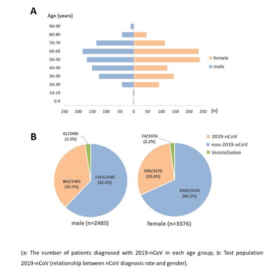 2019-nCoV阳性组中,两名受试者仅对2019-nCov-ORF1ab呈阳性,同一天重新取样显示相同结果,在第二天和第三天重新取样对nCov-ORF1ab和nCoV-NP显示阳性结果。6名受试者仅对nCov-ORF1ab呈阳性,第4天重新取样证实。其中1例nCoV-NP阳性,第3天复查、复样证实。42名受试,5.5天(范围2.5-7.0)后通过重新取样和再次检查确认nCoV-NP和nCoV-ORF1ab均为阴性。 2019-nCoV-NP和2019-nCoV-ORF1ab在受试人群中的阳性率分别为34.7%和34.7%。2019-nCoV-NP阳性率仅为1.5%,2019-nCoV-ORF1ab阳性率为1.5%,符合2019-nCoV诊断标准(nCoV-NP和nCoV-ORF1ab同时阳性)的占33.2%。如表2所示 受试人群按性别分为两组。图1A显示了每个年龄组诊断为2019-nCoV的患者人数。在2485名男性受试者中,882名(35.5%)被诊断为2019-nCoV感染,61名(2.5%)无法明确诊断。在3376名女性受试者中,999名(29.6%)被诊断为2019-nCov感染,74名(2.2%)无法确定(图1B) 63例鼻咽拭子标本诊断明确,但有2份痰标本显示不能判断,还有1例痰标本检测阴性,但咽拭子检测2019-nCoV为阳性(表2)。 对613份样本进行13种常见呼吸道病原体核酸检测,发现感染一种病原体感染占比14.2%(45/316)。其他病原体检测阳性率如下:甲型流感病毒5.55%(34/613)、鼻病毒4.73%(29/613)、甲型H3N2病毒4.57%(28/613)、呼吸道合胞病毒4.40%(27/613)、乙型流感病毒4.08%(25/613)、冠状病毒2.12%(13/613)、偏肺病毒1.63%(10/613)、H1N1 0.65%(4/613),腺病毒0.65%(4/613),肺炎支原体0.49%(3/613),副流感病毒0.49%(3/613),衣原体0.49%(3/613),博卡病毒0.33%(2/613)(图2a)。 212份2019-nCov阴性样本中,其他病原体感染率为18.4%(39/212)。13种呼吸道致病菌的核酸阳性率分别为:甲型流感病毒5.66%(11/202),甲型H3N2病毒5.66%(11/202),鼻病毒4.72%(10/202),呼吸道合胞病毒3.30%(7/202),乙型流感病毒2.83%(6/202),偏肺病毒1.89%(4/202),冠状病毒0.94%(2/202)(图2B)。 104份2019-nCoV阳性样本中,有5.8%(6/104)合并感染。13种呼吸道病原体的核酸阳性率分别为:冠状病毒2.88%(3/104),甲型流感病毒1.94%(2/104),鼻病毒1.94%(2/104),甲型H3N2 0.96%(1/104)(图2C)。 我们基于8274份样本初步评估了2019-nCoV的实验室检测结果。 在临床诊断中,虽然大多数受试者表现出明确的诊断,但有些受试者并没未出现症状。这不利于治疗潜在感染和2019-nCoV疫情的控制。此外,2019-nCoV可能与其他病原体共感染;但是,共感染病原体的类型和2019-nCoV感染的比例尚不清楚;这些共感染情况是否需要改善目前的治疗尚不清楚。 对8274份密接者的样本进行进行检测发现,2745名(33.2%)检测2019-nCoV阳性,5277名(63.8%)呈阴性结果。252例(3.0%)由于只有一个靶基因呈阳性,暂时无法明确诊断。男性感染率(35.5%)高于女性(29.6%)。在104名2019-nCov检测呈阳性的患者中,5.8%的患者与其他病原体共同感染。我们的发现为临床试验、临床诊断和治疗以及2019-nCoV疫情控制提供了重要数据。 只有一个靶基因阳性的检测结果需要进一步关注。从临床测试的角度来看,这可能是因为样本采集问题。样品质量差,严重影响临床检测结果。我们比较了同一天采集的63名受试者的痰标本和鼻咽拭子标本。63例鼻咽拭子检查结果非常清楚,而痰标本Ct值为37~40,部分假阴性。这可能是因为痰不是均匀的物质。 在提取核酸时,痰样的采样部位会影响提取核酸中2019-nCoV的质量和数量,进而影响检测结果。此外,痰在气管中的性质和位置也有很大的不同。这可以防止在采样过程中有效控制样本质量,从而影响检测结果,特别是在病毒尚未繁殖的感染早期患者。第二,使用咽拭子作为鼻咽部弯曲的柔韧性和形状改变,因此可以从更深的位置获得样本,这有助于收集具有较高病毒含量的样品。 此外,2019年nCoV疫情目前是严重的公共卫生威胁,因此应指定具有丰富临床采样经验的人员采集样本。最后,采样时要注意环境污染,医院管理部门要建立专门的采样室和管理措施,防止样品受到环境中2019-nCoV的污染。 还应考虑与样品预处理有关的问题。在对样本进行临床试验之前,需要进行核酸提取等步骤。实验操作人员和管理人员应注意实验室是否具备检测资质。实验室环境及其设备应具有防止样品交叉污染、防止人员职业暴露的能力,并配备综合消毒设备和职业暴露应急措施。只有nCovORF1ab在评估时呈阳性结果,在接下来的几天重新取样和复查后,两个目标呈阴性,因此可能发生了污染。污染可能由取样或处理过程引起。此外,熟悉所需实验技能的人员应进行分析。最后,2019年nCoV检测试剂盒应符合临床要求。 对于检测问题,检验人员和管理人员应确定所使用的试剂盒是否符合要求的标准,试剂是否妥善存放,所使用的设备是否有老化部件。 对于病毒感染的病理过程,我们观察了一例nCoV-ORF1ab阳性者在同一天重新取样检测,结果一致。nCoV-NP和nCoV-ORF1ab阳性,第二天重采样证实。因此,不明确的诊断可能与患者的病理分期有关。 由肺炎链球菌和金黄色葡萄球菌产生的细菌蛋白可促进流感病毒的传播。因此,从机制的角度来看,其他病原体感染(非2019-nCoV感染)引发肺炎的患者比健康人更容易合并感染2019-nCoV。相比之下,感染2019-nCoV的人(特别是重症患者)也会有继发感染其他病原体。陈南山等对99例2019-nCoV感染患者进行研究,发现1例细菌感染,4例真菌感染。这些问题表明临床试验需要新的要求。在这项研究中,我们检测了13种呼吸道病原体的存在,以检测非细菌感染;然而,为了检测细菌病原体的感染,医疗机构通常使用传统的涂片和培养物。众所周