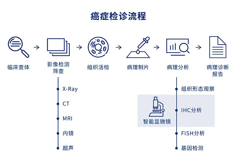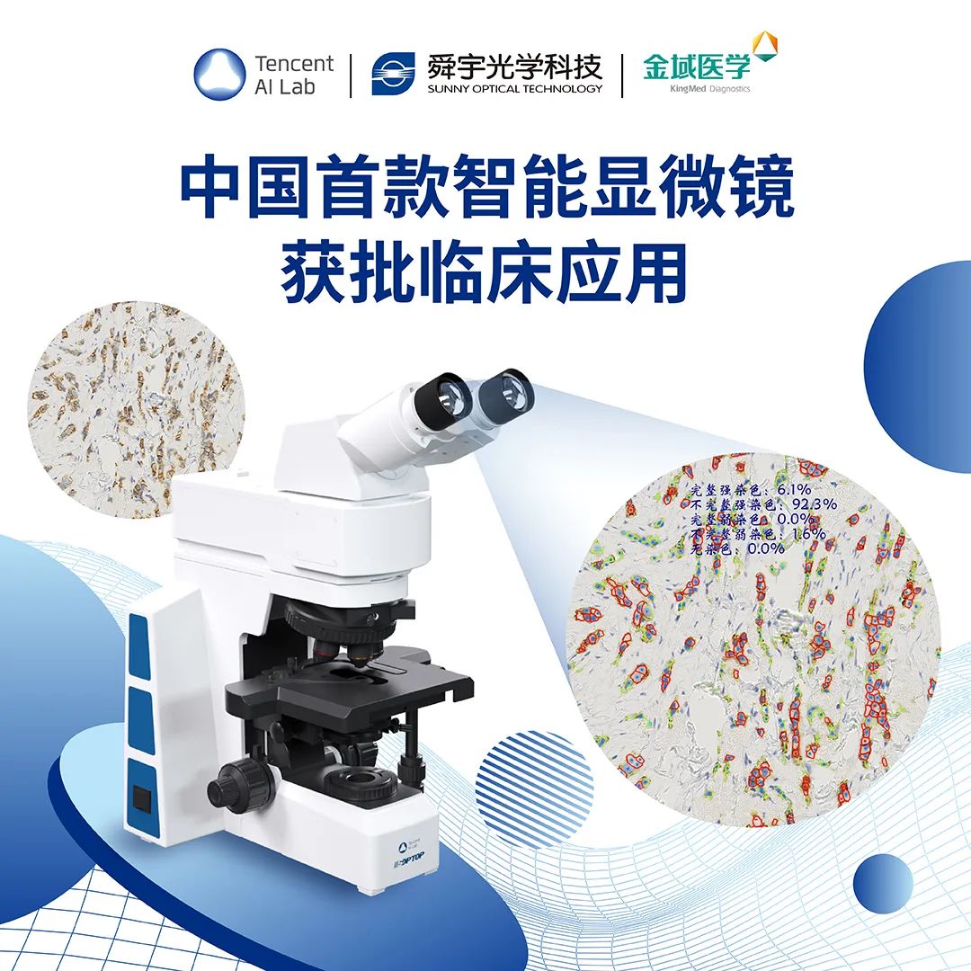 钟南山院士曾表示:「临床病理水平是衡量国家医疗质量的重要标志」,而检查、诊断“众病之王”癌症的病理学检查中,显微镜观察必不可少。腾讯 AI Lab 联合业界领先的舜宇光学科技、国内最大的第三方医学检验机构金域医学宣布三方研发的智能显微镜已获得 NMPA 注册证,成为国内首个获准进入临床应用的智能显微镜产品。 该智能显微镜产品研发始于 2018 年,集成了目前病理分析与诊断方面的最新技术,并针对病理医生工作流程和习惯进行多次产品迭代,现已支持乳腺癌免疫组化(IHC) Ki67(肿瘤细胞增殖指数)、ER(雌激素受体)、PR(孕激素受体)和 Her2(细胞表面生长因子2)等常用核染色和膜染色量化分析场景的判读。 该产品在测试被证明能有效提升病理医生的工作效率、病理分析的精确度和一致性,有望缓解医院(尤其是基层医院)病理医生数量短缺且经验不足的问题,也是精准医疗从前沿研究走向落地探索的一个良好例证。 智能显微镜目前使用了离线运算版本,腾讯 AI Lab 还研发了一套基于深度学习方法的升级版算法,具有更高精准度和升级潜力,期待能尽早通过认证后推向市场,辅助医生诊断。 行业痛点:病理诊断作用关键,但相关医疗人才缺口大 大致来说,癌症检诊流程主要包含以下几个步骤,腾讯智能显微镜希望在病理分析和诊断两个关键环节为医生提供更多帮助。