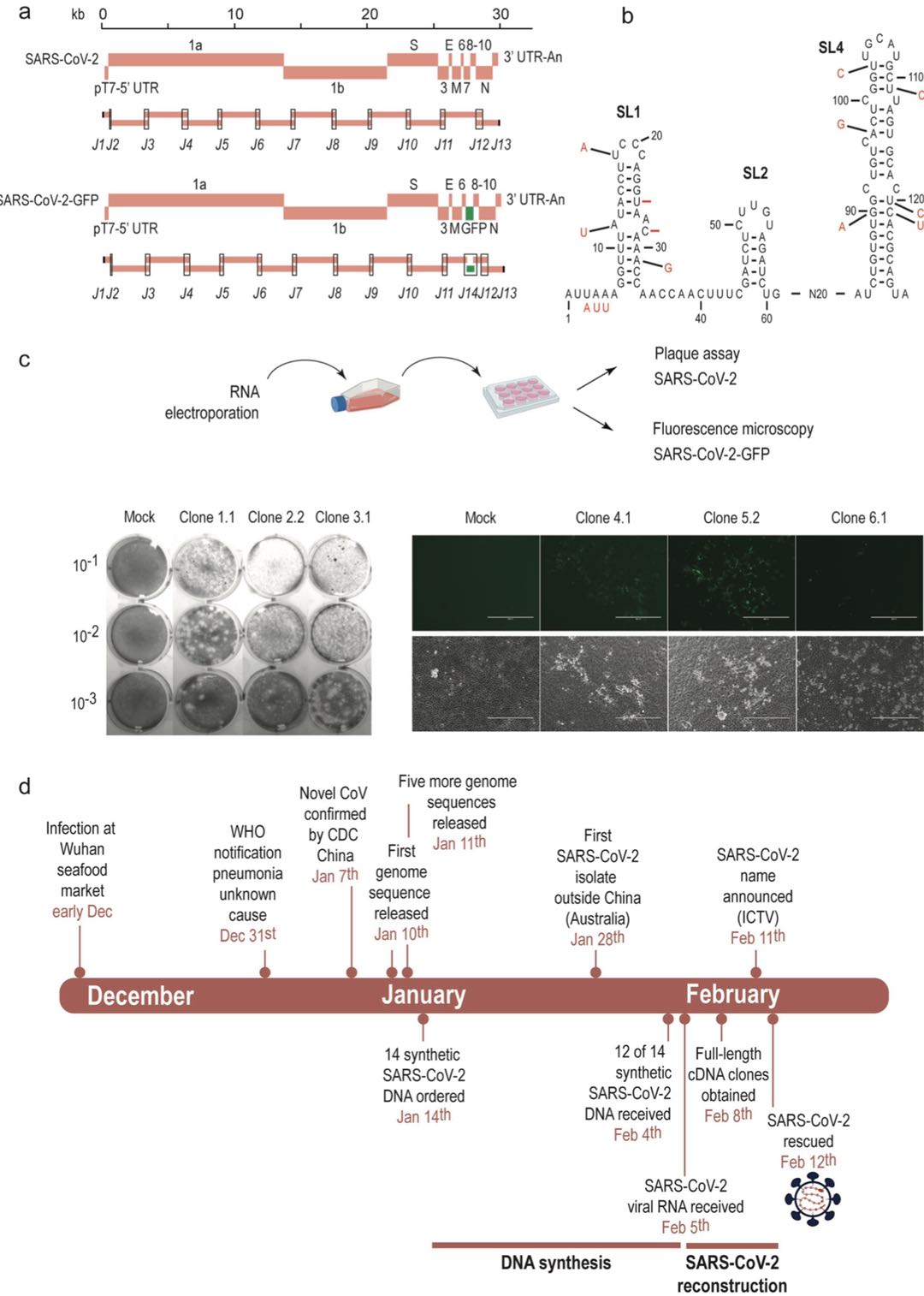 酵母中转化偶联重组DNA 研究者将反义DNA拆解成12个长0.5-3.4 kbp具有重叠末端序列的DNA片段,并引入GFP(绿色荧光蛋白序列),利用酿酒酵母中的同源重组系统,使得反义DNA在酵母菌中重组成完整的基因序列。之后,在体外,用T7 RNA聚合酶将反义DNA转录成为有感染性的病毒RNA。通过电穿孔将RNA导入后,发现正常的VeroE6细胞能够被感染并发出荧光。