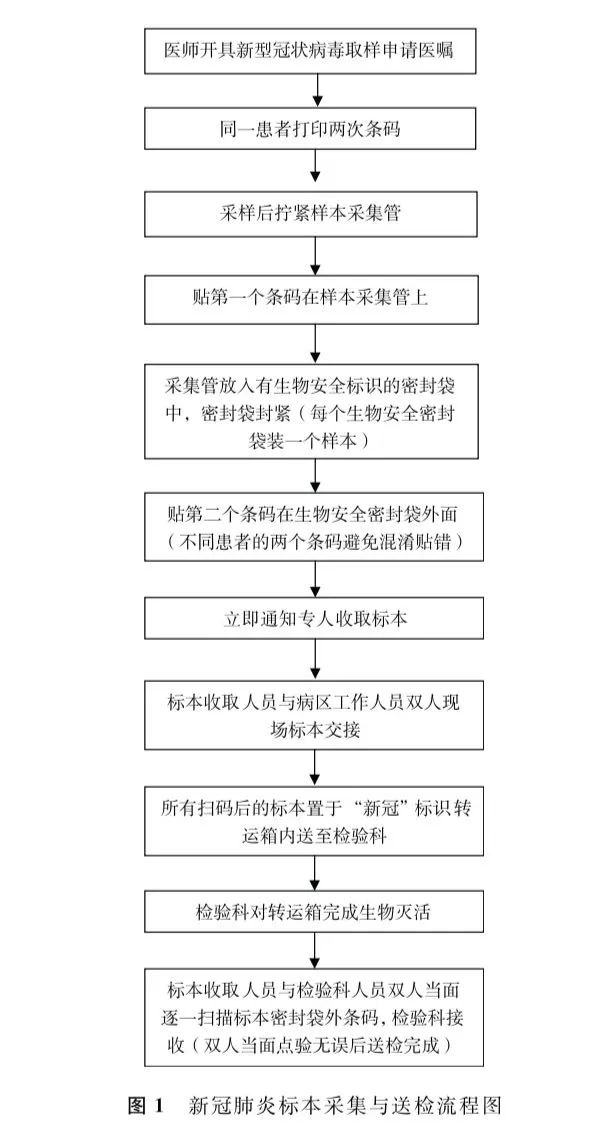 标本采集在促进临床诊断新型冠状病毒感染中发挥着重要的角色。为规范临床医务人员进行新冠肺炎患者标本采集技术行为,减少医务人员职业暴露,提高送检标本的合格率和标本质量,笔者团队严格按专家共识制订规范要求,完成文献检索、文献评价及总结和两轮专家函询会,最终形成了《新冠肺炎患者标本采集技术专家共识》,并顺利通过中华护理学会团体标准委员会的审核。本共识提出了新冠肺炎患者标本采集技术的适用范围、术语和定义、缩略语、标本采集基本要求、操作程序、及标本采集期间意外事件的应急处理,供临床参考。本共识给出了新冠肺炎患者标本采集的基本要求、操作程序、意外事件预防及处理原则,不包含支气管和肺泡灌洗液标本的采集。本专家共识适用于各级各类医疗机构的医护人员。2.1 标本采集(specimen collection)根据检查项目需求,采集患者的血液、体液(如胸腔积液、腹水)、分泌物(如鼻咽部分泌物)、排泄物(如尿、粪)等标本进行实验室检测,以辅助临床制定评估、诊疗决策的操作技术。2.2 微生物学检验标本(clinical microbiological specimen)临床病毒学、细菌学和真菌学检验(包括涂片镜检、培养、抗原、抗体和分子生物学技术等)所用的标本。2.3 拭子样本采集(swab sampling collection)用于采集含病原微生物标本的拭子,由两部分组成。(1)涂抹棒:柄部常为塑料或铝杆,柄部的一端是具有吸附作用的采样头,采样头材质包括脱脂棉、合成聚醋纤维、聚眈胶纤维、人造丝和泡沫聚氨醋等。(2)手柄:位于柄部的另一端,也可作为转运装置(容器或管)的帽。2.4 鼻咽拭子(nasopharyngeal swab)采集鼻部分泌物的拭子,采集后用于检测细菌、病毒。2.5 口咽拭子(oropharyngeal swab)采集咽部和扁桃体分泌物的拭子,采集后用于检测细菌、病毒。2.6 深咳痰液(deep cough sputum)在医务人员指导下患者由气道远端咳出的分泌物,痰液。2.7 支气管分泌物(bronchial secretion)由腺体或局部杯状细胞产生分泌物所组成,在正常情况下每天约10~100mL。2.8 真空采血系统(vacuum blood collection system)运用真空负压原理,通过特定的连接装置将人体静脉血液转移至标本盛装容器的器械组合。(ethylene diamine tetraacetic acid)BSL:生物安全级别(biosafety level)4.1医疗机构应制定并执行新冠肺炎标本采集与送检流程。见图1。4.2所有标本采集人员应掌握标本采集相应技术规范、操作规程、生物安全防护等,并考核合格[1-2]。4.4应根据检验项目制定申请单,申请单提供的信息,可依据WS/T640-2018的标准[3-4]。4.5应对患者进行评估,根据评估结果选择标本采集的装置、部位和方法。[5]4.6标本收集容器应遵循WS/T 224-2018规范[6]。4.7标本采集过程中的感染控制应遵循WS/T 511-2016规范[7]。4.8标本采集期间产生的医疗废弃物应按照WS/T 510-2016规范[8]进行处置。4.9标本采集过程中应观察患者生命体征变化,及时识别并处理并发症,必要时停止标本采集。5.1.1应评估患者的年龄、意识、自理能力、配合程度等综合因素[3]。5.1.2采集呼吸道标本时,应评估患者的口鼻腔黏膜有无出血、血氧饱和度、呼吸功能等。5.1.3采集血液标本,应评估血管条件、穿刺部位[6-9]。5.2.1上呼吸道标本(鼻、口咽拭子)应在发病1~7d内采集,尽可能采集发病3d内的鼻咽拭子标本[1-4,10]。5.2.2下呼吸道标本 适用于有人工气道患者,重症患者优先采集下呼吸道标本[3,10]。5.2.3核酸检测的血液标本应采集发病后7d内的空腹血,使用含有EDTA抗凝剂的真空采血管采集血标本5mL[1]。5.2.4抗体测定的血清标本应采集发病后7d内和发病后第3~4周空腹血,使用无抗凝剂的真空采血管采集血液标本5mL[1]。5.2.5粪便采样指征:粪便常规标本检查;患者出现腹腹泻等消化道症状。 |