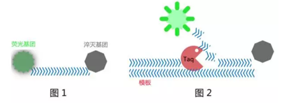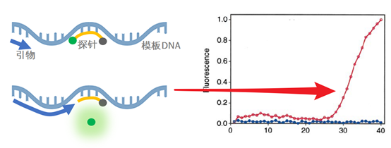 可以核酸提取和实时荧光RT-PCR反应体系参考相关厂家试剂盒说明。 2.结果判断 阴性:无Ct值或Ct为40。 阳性:Ct值<37,可报告为阳性。 可疑:Ct值在37-40之间,建议重复实验,若重做结果Ct值<40,扩增曲线有明显起峰,该样本判断为阳性,否则为阴性。 实际上在2020年的1月17日,世界卫生组织就已经发布《Diagnostic detection of 2019-nCoV by real-time RT-PCR》,其中也公布了引物、探针的详情: 由此开始,包括生工生物在内的国内外大小Oligo合成公司,纷纷放弃了春节假期,加班加点生产上述引物和探针。截至2020年2月1日,生工生物已经累计生产检测用探针、引物共约720万人份,这些诊断原料被迅速发送给国内外大小诊断试剂盒公司,组装出的nCoV诊断试剂盒被迅速送往各地医院和相关检测诊断机构。 生工生物,以诊断原料的上游供应商身份,参与到了这场轰轰烈烈的战疫洪流中。 那么这小小的短短的探针,是如何在疫情诊断方面发挥巨大作用的? 用牺牲换来光芒——TaqMan探针法qPCR详解 Taqman探针法的检测原理 Taqman探针法荧光定量PCR,通过在常规的PCR体系中引入一条Taqman探针来进行实时荧光检测。这条Taqman探针是一条寡核苷酸,其能够结合到PCR正反向引物结合区域的内部,随着PCR反应的进行,DNA聚合酶在延伸到探针位置会将其水解,从而产生信号。因此Taqman探针属于水解探针的重要成员之一。 Taqman探针的5端标记有荧光基团,3端标记有相应的淬灭基团。由于Taqman探针长度的限制,当探针完整的时候,荧光基团处于淬灭基团的淬灭范围内,荧光大部分被淬灭基团吸收或转换为别的波长的光,此时仪器检测不到相应的荧光值。在PCR退火过程中,探针优先结合到待扩增区域,然后DNA聚合酶从引物位置开始延伸,一直延伸到探针位置,此时DNA聚合酶的5-3核酸外切酶能够将Taqman探针水解。水解之后,荧光基团脱离了淬灭基团的束缚,释放出强烈的荧光,从而被仪器检测到。 为什么能够定量? 由于在PCR体系中探针的添加是过量的,只要探针设计合理,体系中所有的模板都能跟相应探针相结合。因此,体系中的模板量越多,结合上去并被水解的探针就越多,荧光值的积累就越快,得到的相应Cq值就越小。 探针序列的设计原则 并不是任意一段序列都适合作为Taqman探针,其设计要掌握以下几个原则: 1. Tm值及长度 Taqman探针的长度最好在25-32bp之间,且Tm值在65-72°C之间,确保探针的Tm值要比引物的Tm值高出5~10°C,在退火过程中优先结合到模板上。 2. 探针的序列 ● 探针序列要与模板能够完全互补配对,探针尽量避免出现二聚体或者高级结构,以保证足够高的模板结合效率。 ● 探针的5端最好紧邻对应引物(结合同一模板链的那条引物)的3端,这样能够保证在PCR扩增时第一时间将探针水解释放荧光信号。 ● 探针两端的各两个碱基不能为G,即使单独的G碱基也会对荧光基团产生淬灭作用,从而影响荧光或者淬灭效率。 ● 整条探针中,碱基C的含量要明显高于G的含量,较多的G会产生高级结构,对探针的合成以及使用产生负面效果。 qPCR诊断如何操作? 小编用最简单的图示,简要介绍一下用探针法qPCR进行nCoV的诊断流程: 1. 样本提取 提取待检测者的生物样本中的RNA,通常是:上呼吸道标本:包括咽拭子、鼻拭子、鼻咽抽取物。下呼吸道标本:包括深咳痰液、呼吸道抽取物、支气管灌洗液、肺泡灌洗液、肺组织活检标本。血液标本:尽量釆集发病后7天内的急性期抗凝血。4.血清标本等。 使用RNA提取试剂盒,将其RNA提取出来。 2. 逆转录 由于提取出来的核酸数量极少,因此必须使用及其灵敏的手段将其扩增检测出来,PCR就是最佳选择之一,但PCR过程使用的酶是DNA聚合酶,其只能以DNA为模板进行扩增富集,因此在进行PCR之前,需要将提取出的RNA进行逆转录,使其变为反向互补的DNA(cDNA)。 3. qPCR检测 选用针对新型冠状病毒的ORF1ab、N基因区域的引物和探针试剂盒,对逆转录出的样本进行检测(某些试剂盒,为了节省时间防止污染,将逆转录和qPCR放在一个体系中进行)。 在退火过程中引物和探针能够结合到靶标cDNA上,引物结合上之后,在PCR酶的作用下进行延伸,当延伸至探针结合区域时,PCR酶的5-3核酸外切酶活性会将探针水解,从而造成荧光与淬灭基团分离,此时,水解掉的探针呈现明亮荧光,从而被qPCR仪侦测到,体现为一条S型扩增曲线。 探针法的特点 ●特异性高 相比于染料法荧光定量PCR,Taqman探针法通过探针的引入,极大提升了qPCR反应的特异性。即使引物有二聚体或者非特异性条带扩增,由于没有探针的参与水解,也不会产生荧光信号,不会对定量产生影响。 这也是为什么WHO和CDC公布的检测方法都是探针法。 ●适用于多重qPCR 探针法的另一个优点是可以做多重qPCR,能够同时检测多个指标的含量。在保证足够的扩增效率的情况下,有的研究者会将两套甚至更多引物和探针置于一个qPCR体系中,通过探针标记的荧光基团不同,分别检测相应的荧光信号变化。这样极大节省了qPCR酶的用量,降低了成本。并且某些检测,如SNP的探针法检测,是一定要使用不同的探针在统一体系下进行检测的。比如,将CDC公布的两套检测探针中使用不同的荧光基团标记,这样可以在一个反应体系中进行两个靶点的检测,这样极大节约了成本、时间,同时也增加了检出率。 对照很重要 在进行qPCR诊断检测过程中,对照组的意义重大,以下几个对照组是必不可少的: ● 阳性对照:排除实验失