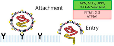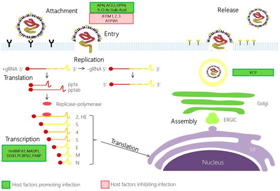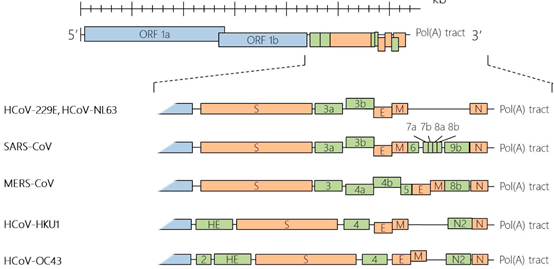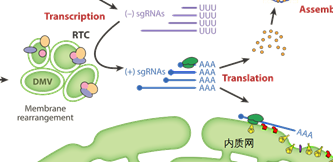 《柳叶刀》于近期公布了这种病毒的彩色样张,并模拟成了致命的粉红色,可以说是形象地描述了该病毒的样貌。冠状病毒(Coronaviruses,CoV)是一类有蛋白包裹的单股正链RNA病毒,呈圆形或者椭圆形,直径大概100nm左右。 真实的它长这个样子: 毒种编号:CHPC 2020.00002; NPRC 2020.00002 中文名称:新型冠状病毒武汉株02 分离时间:2020年1月22日 照片来源:国家病原微生物资源库(中国疾病预防控制中心病毒病预防控制所) 2019-NcoV的基因组长度为29.8kb,主要由orf1a/b、S、E、M、N以及其他附加序列如5端帽子3端polyA序列组成。 上图为2019-NcoV的基因组结构示意图,序列信息来自于NCBI。 下图显示了之前发现的冠状病毒,其基因组结构非常类似: 图片来自于《Human Coronaviruses: A Review of Virus–Host Interactions》,DOI:10.3390/diseases4030026 orf1a/b:负责表达病毒的复制酶 S:负责表达刺突蛋白 E:负责表达包膜蛋白 M:负责表达膜糖蛋白,E和M共同组成了病毒的包膜 N:负责表达病毒的核衣壳蛋白,能够结合到RNA基因组 有了这些结构和功能蛋白,即可组装成一个完整的病毒了,下图显示了SARS病毒的结构,与新冠病毒一致。 图片来源Severe acute respiratory syndrome,DOI: 10.1038/nm1143 2010年,“科学怪人”克雷格·文特尔将他的“辛西娅”——一种以丝状支原体和山羊支原体人工组合而成的最小人造生命体,推向了大众的视野。至此,这位伟大的科学家走上了一条简化生命基因组的不归路。一直到2016年的辛西娅3.0版本,其带有473个基因,基因组总长度531kbp。 而病毒这种生命与非生命的边缘存在,仅用了十余个基因,就给人类带来了巨大的灾难,使我们无不感受到大自然的精妙与无情。 那么如此精妙的结构是如何达到自我繁衍的呢?下面小编以最简单的描述,带大家走一遍病毒的复制之路。 nCoV病毒的复制——一场半自助的盛宴 众所周知,病毒是以细胞为宿主进行复制繁衍的。一个病毒没有眼睛的情况下该如何判断自己接触的是否是合适的细胞呢?此时,需要借助自己的“感官”:S蛋白,没错,这一切都是从S蛋白接触到它的受体开始。 接触-释放 对于nCoV,当其S蛋白结合到了其受体血管紧张素转化酶2(ACE2)时,会驱动S蛋白中的S2亚基的构象改变,促进了病毒包膜与细胞膜的融合。同时S2亚基的构象变化也导至释放核衣壳进入细胞质。 生产复制聚合酶 核衣壳释放到细胞质后,病毒gRNA通过核糖体翻译产生聚蛋白pp1a和pp1ab。pp1a和pp1ab被宿主和病毒蛋白酶自身水解生成十几个非结构蛋白(NSPs)。这些非结构蛋白会组装成为然后组装成病毒的复制聚合酶(replicase-polymerase)。 基因组RNA的复制与转录 复制聚合酶以病毒的基因组RNA作为模板,合成全长的反义基因组;而以反义基因组为模板,又可生成新的基因组RNA。复制聚合酶还以可在基因组的特定位点进行不连续转录,从而产生一系列反义亚基因组RNA(subgenomic RNA,sgRNA),并以其为模板合成一系列具有翻译功能的正义亚基因组RNA,如上图。到了此步,病毒已经有了待组装的基因组RNA。 生产结构蛋白 有了具有翻译功能的亚基因组RNA,病毒即可通过5’带帽或者核糖体渗漏扫描、核糖体内部进入等方式来生产其它蛋白了。如跨膜结构蛋白(S,HE,M 和 E)和一些与膜相关的辅助蛋白在内质网中翻译,而N蛋白则通过胞质中游离核糖体翻译。到此步,病毒已经有了待组装的结构蛋白。 组装、释放 在内质网-高尔基体中间体,在M蛋白主导下,将所产生的病毒gRNA和结构蛋白进行组装,并以平滑壁囊泡的形式在质膜上发芽,通过胞吐排出体外。 至此,病毒在自身及宿主蛋白、酶及一些细胞因子的帮助下,完成了一次看起来简单实则复杂的自我复制组装过程。完整的路径如下: 上述图片均来自于《Human Coronaviruses: A Review of Virus–Host Interactions》,DOI:10.3390/diseases4030026 想要看更详细的过程?可以参阅《Human Coronavirus:Host-Pathogen Interaction》,DOI:10.1146/annurev-micro-020518-115759 延伸阅读:复旦大学 ppxu(网名)大神为我们详细梳理了该病毒的侵染复制过程,详情请点击 Epigenetics表观遗传学 公众号的推送《解读 | 如何才能阻断人类冠状病毒在体内的复制?》 nCoV病毒的qPCR诊断——不吉利的荧光信号 2020年1月21日,中国疾病预防控制中心下属病毒病预防控制所,发布了新型冠状病毒核酸检测引物和探针序列(Specific primers and probes for detection 2019 novel coronavirus)。 具体如下: 1.新型冠状病毒核酸测定(实时荧光RT-PCR方法) 推荐选用针对新型冠状病毒的开放读码框1ab(open reading frame,ORF1ab)、核壳蛋白(nucleoprotein,N)基因区域的引物和探针。 Target 1(ORF1ab):