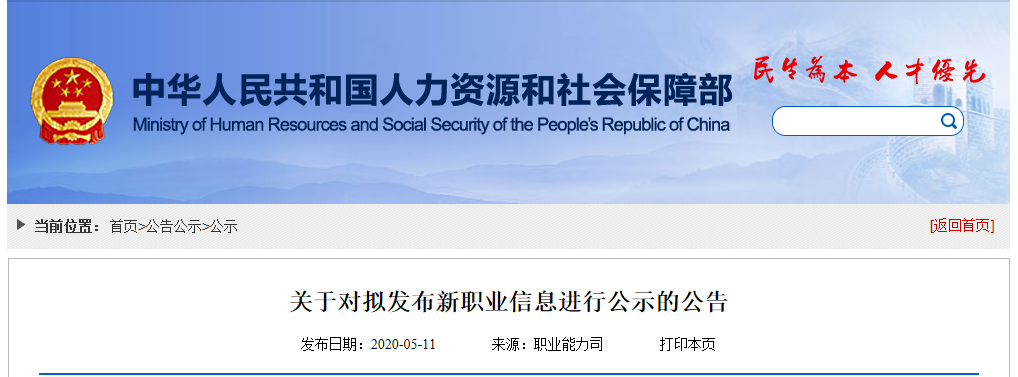 | 2020年5月11日,中华人民共和国人力资源和社会保障部发布《关于对拟发布新职业信息进行公示的公告》。