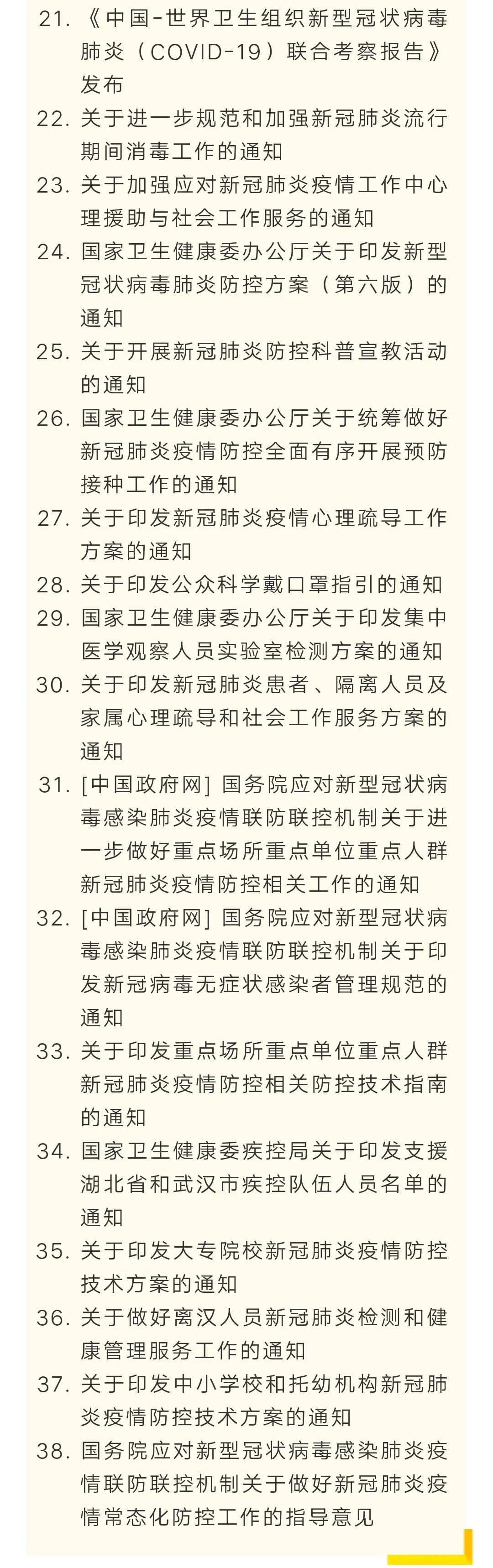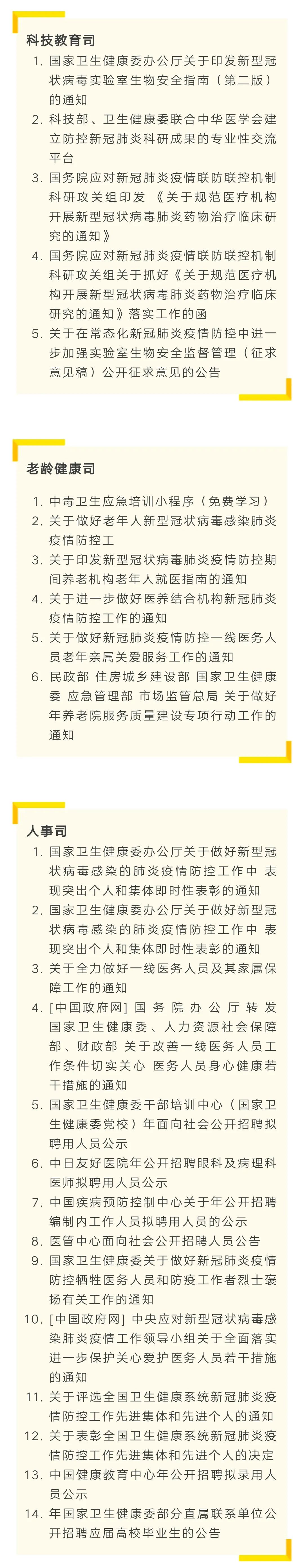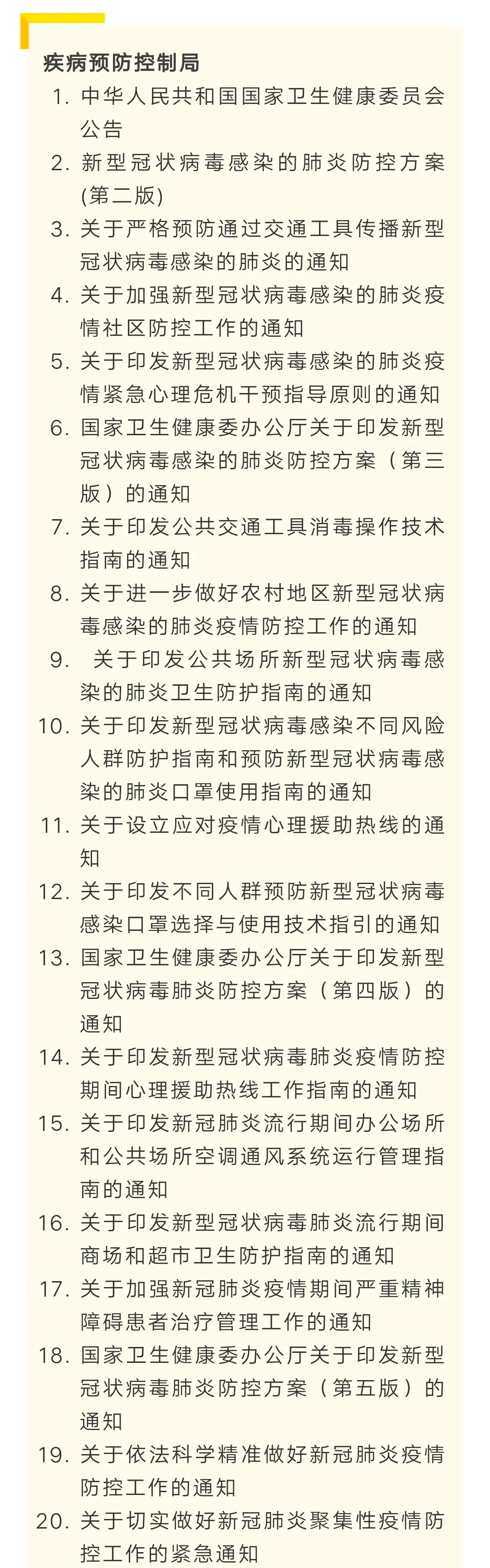 摘要: 写在前面国家卫健委文件新冠肺炎相关文件汇编(截止2020年5月13日),由疾控中心的同志整理。仅做分享,方便大家查阅。目录如下。下载详见文末。传染病防治相关法律法规下载详见:全国性传染病防控工作相关法律法规 ...